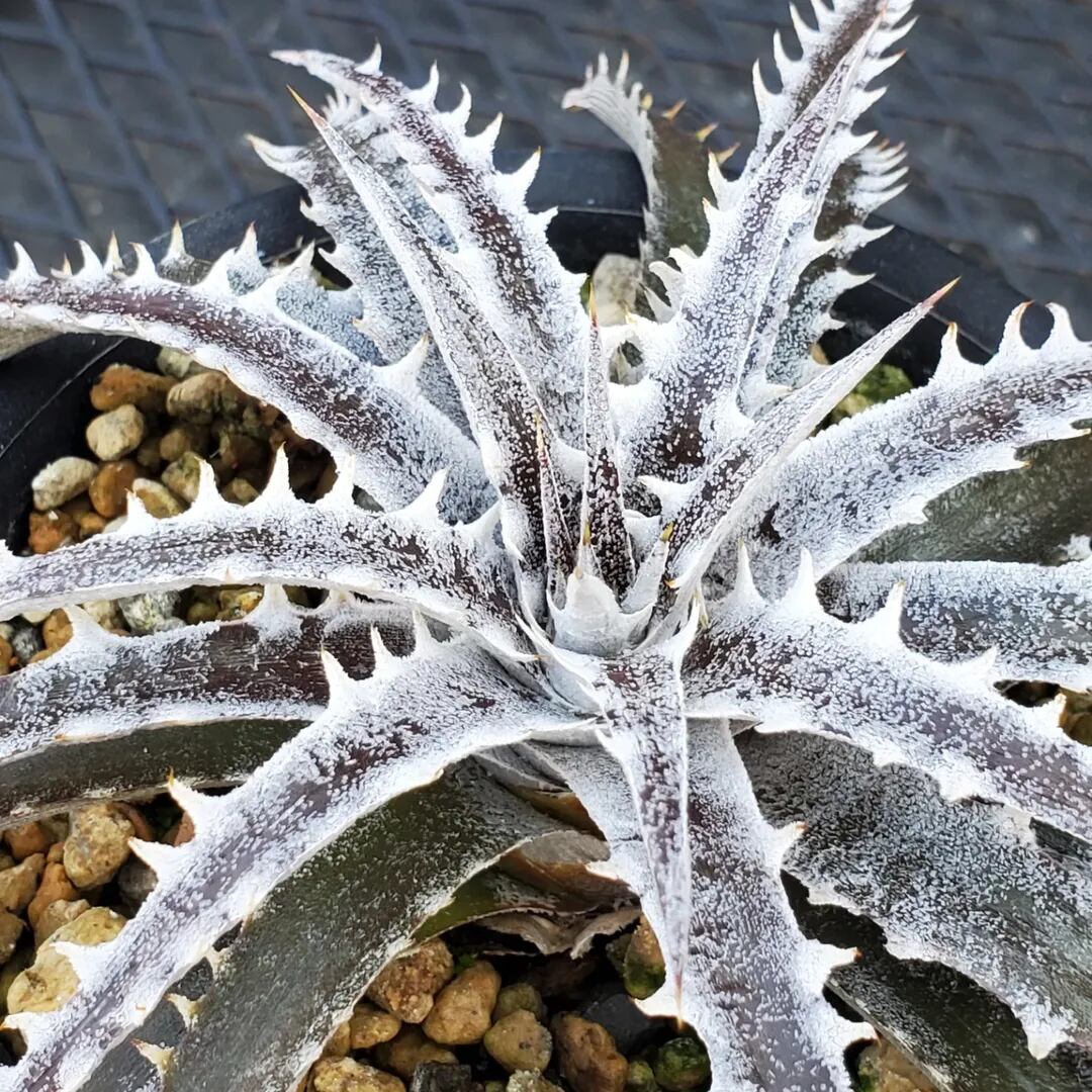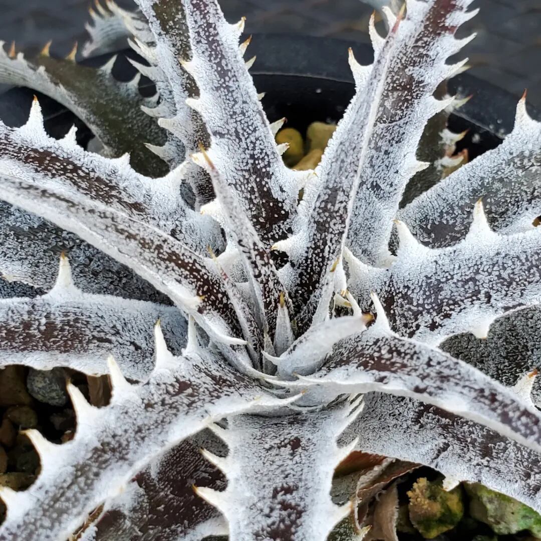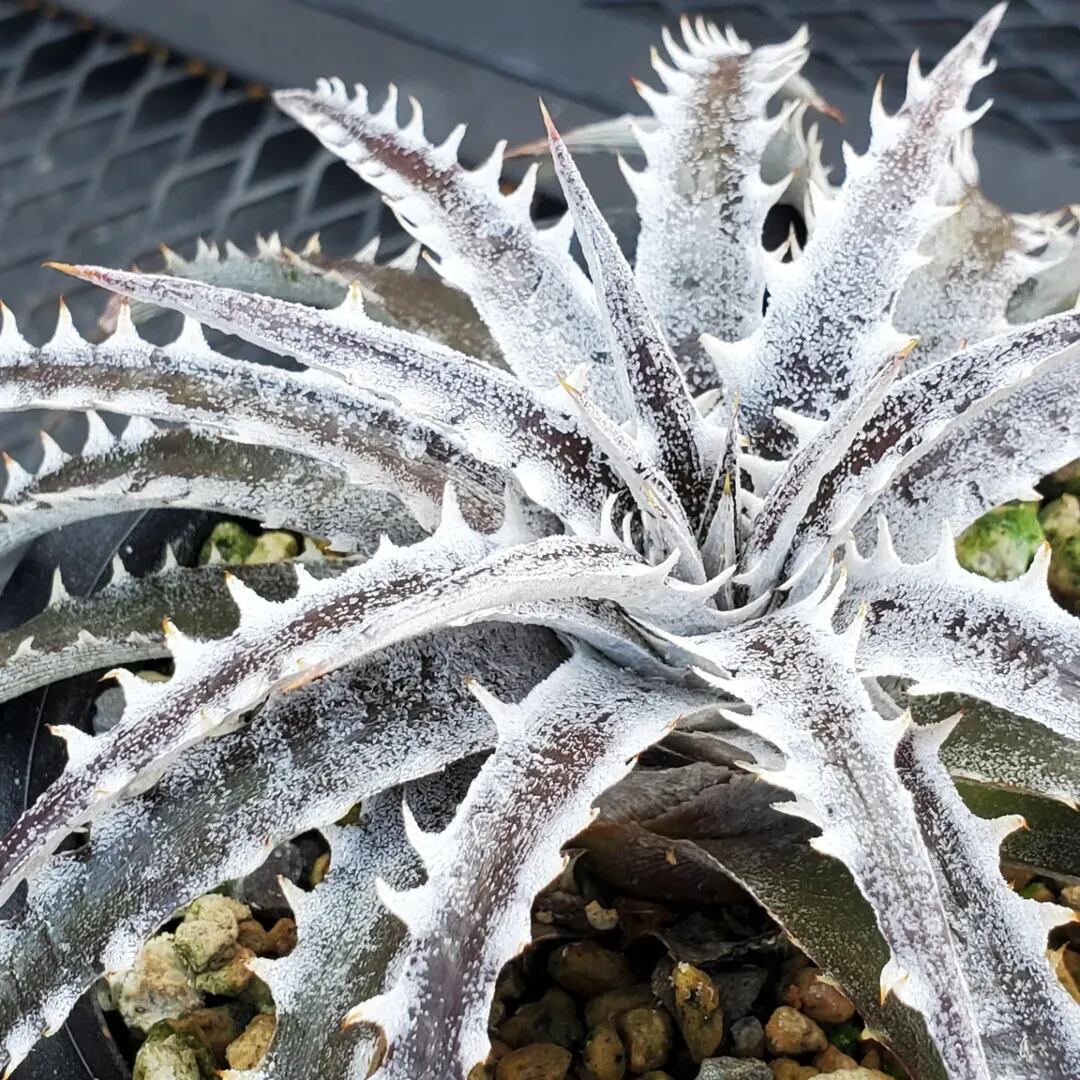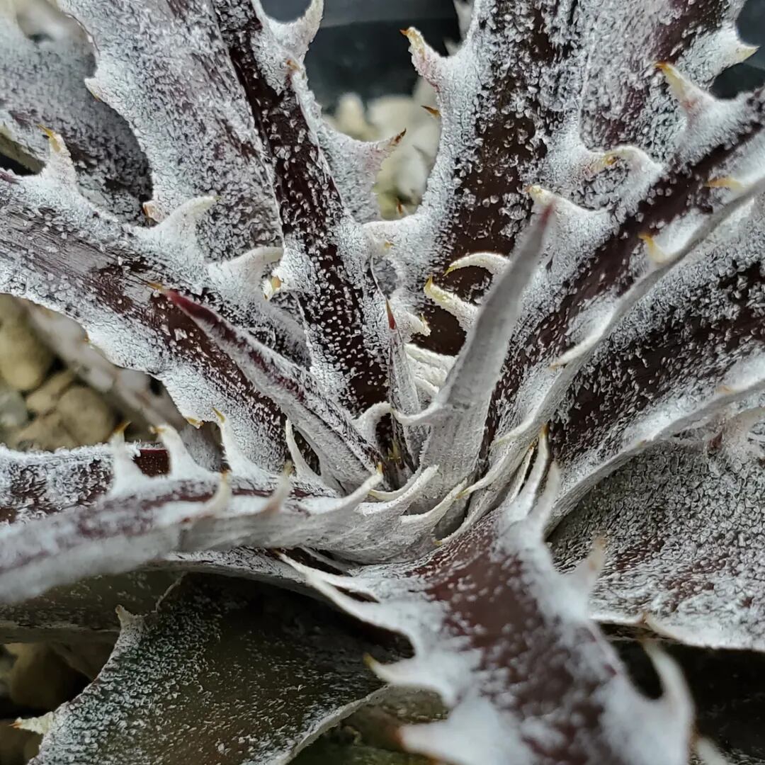 Q氏(Qdyckia)作出のハイブリッドです。鋸歯(Spine)が無いツルツルの葉が出たかと思えば、別の葉では鋸歯が出たりと、不規則に成長する、不思議な品種です。(撮影日:2026年03月08日)
