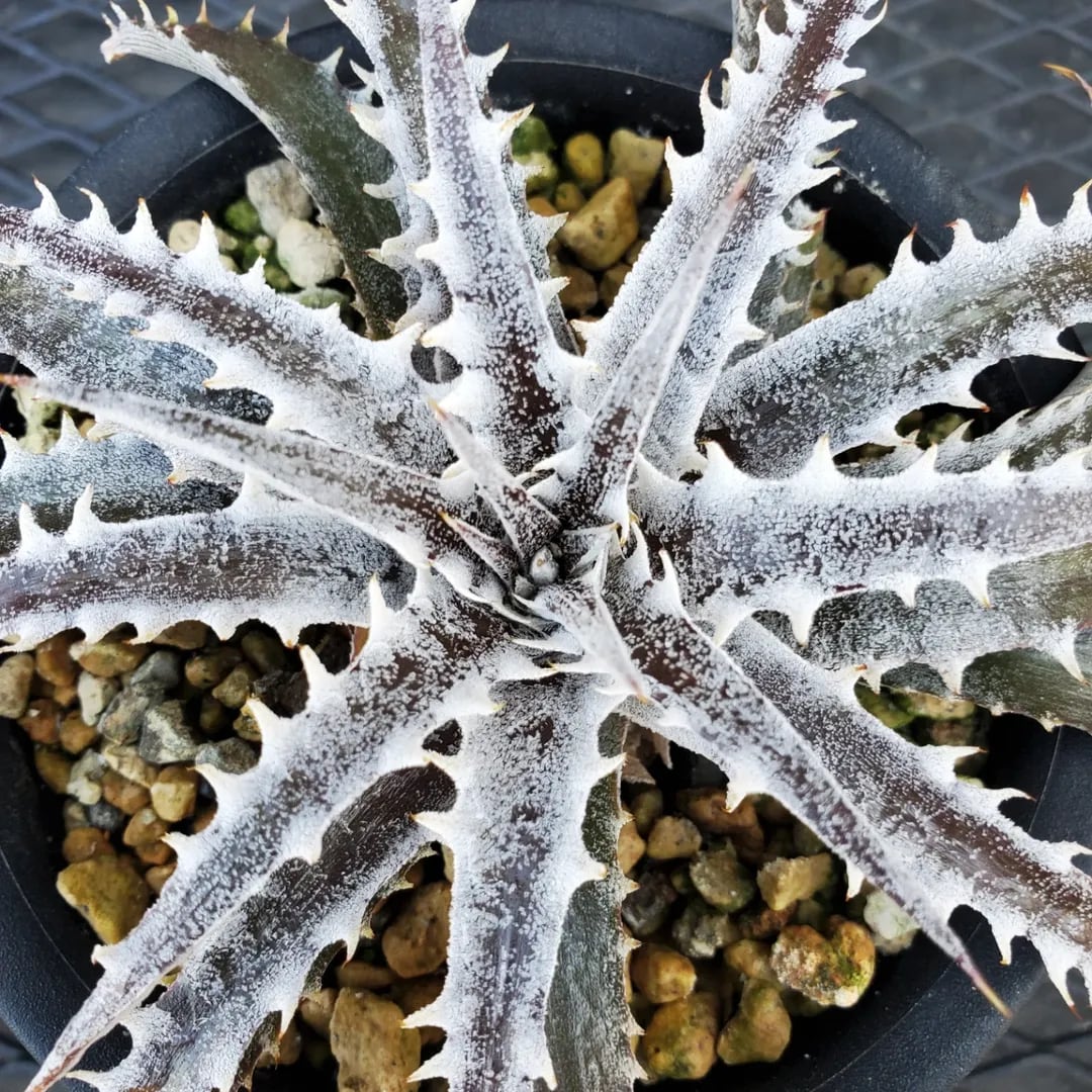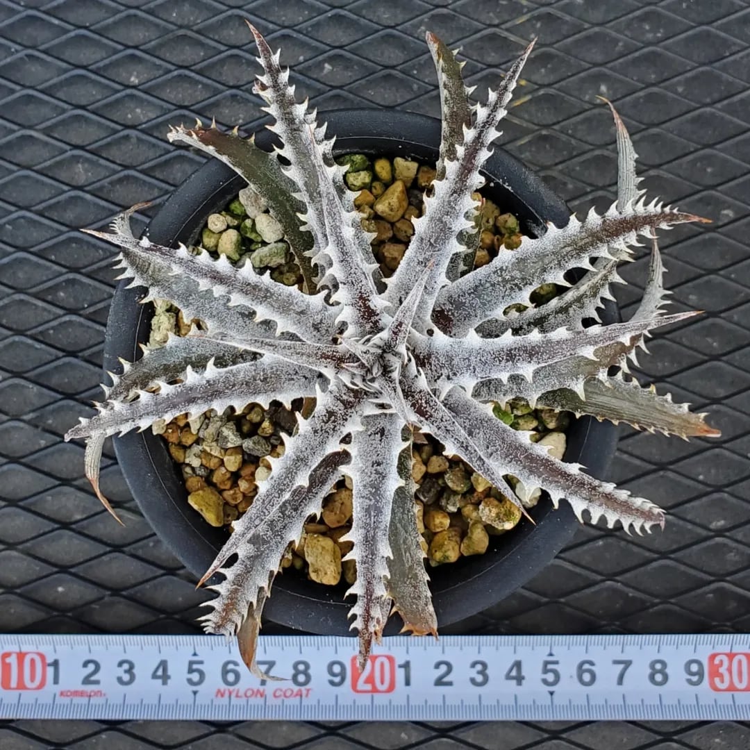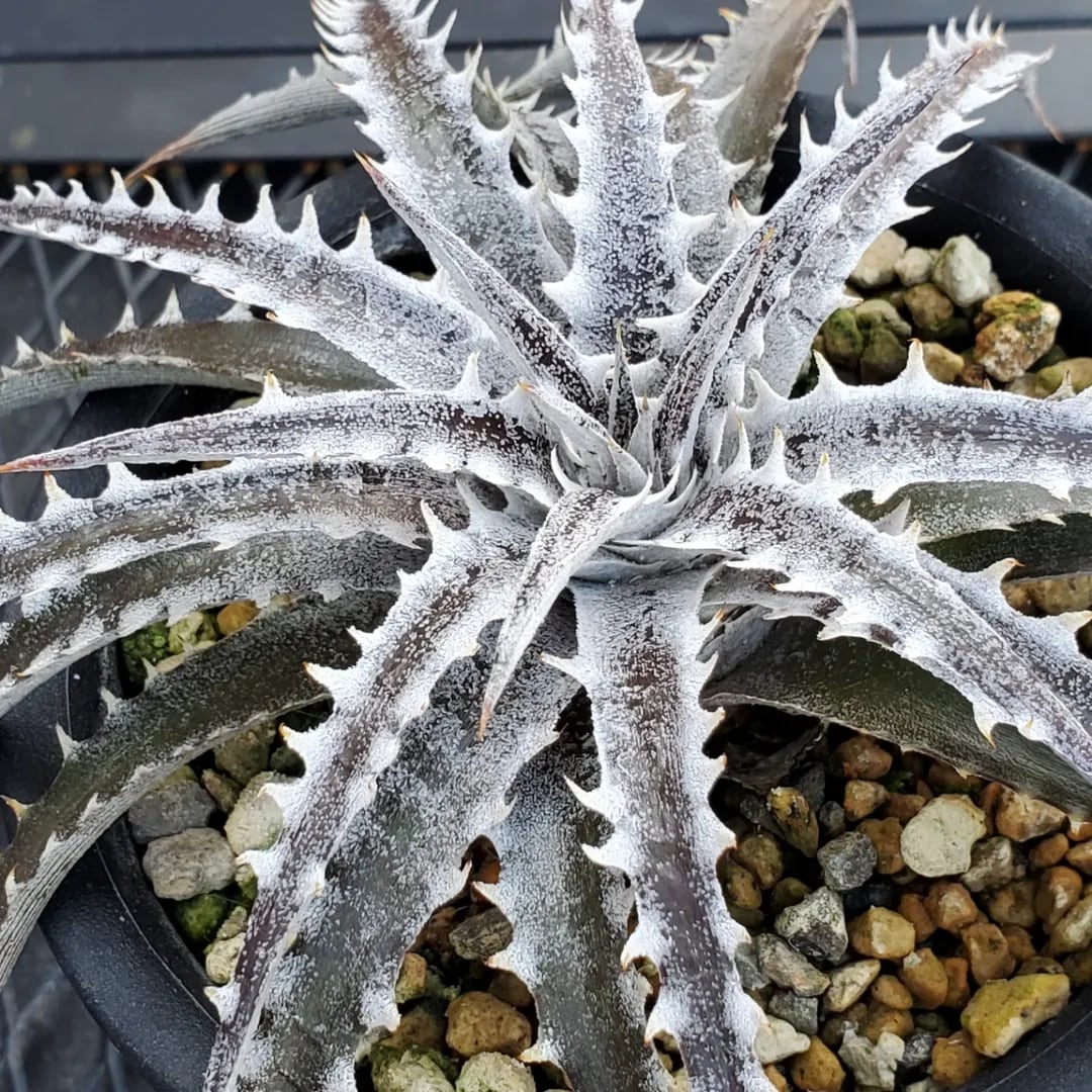 Q氏(Qdyckia)作出のハイブリッドです。鋸歯(Spine)が無いツルツルの葉が出たかと思えば、別の葉では鋸歯が出たりと、不規則に成長する、不思議な品種です。(撮影日:2026年03月08日)