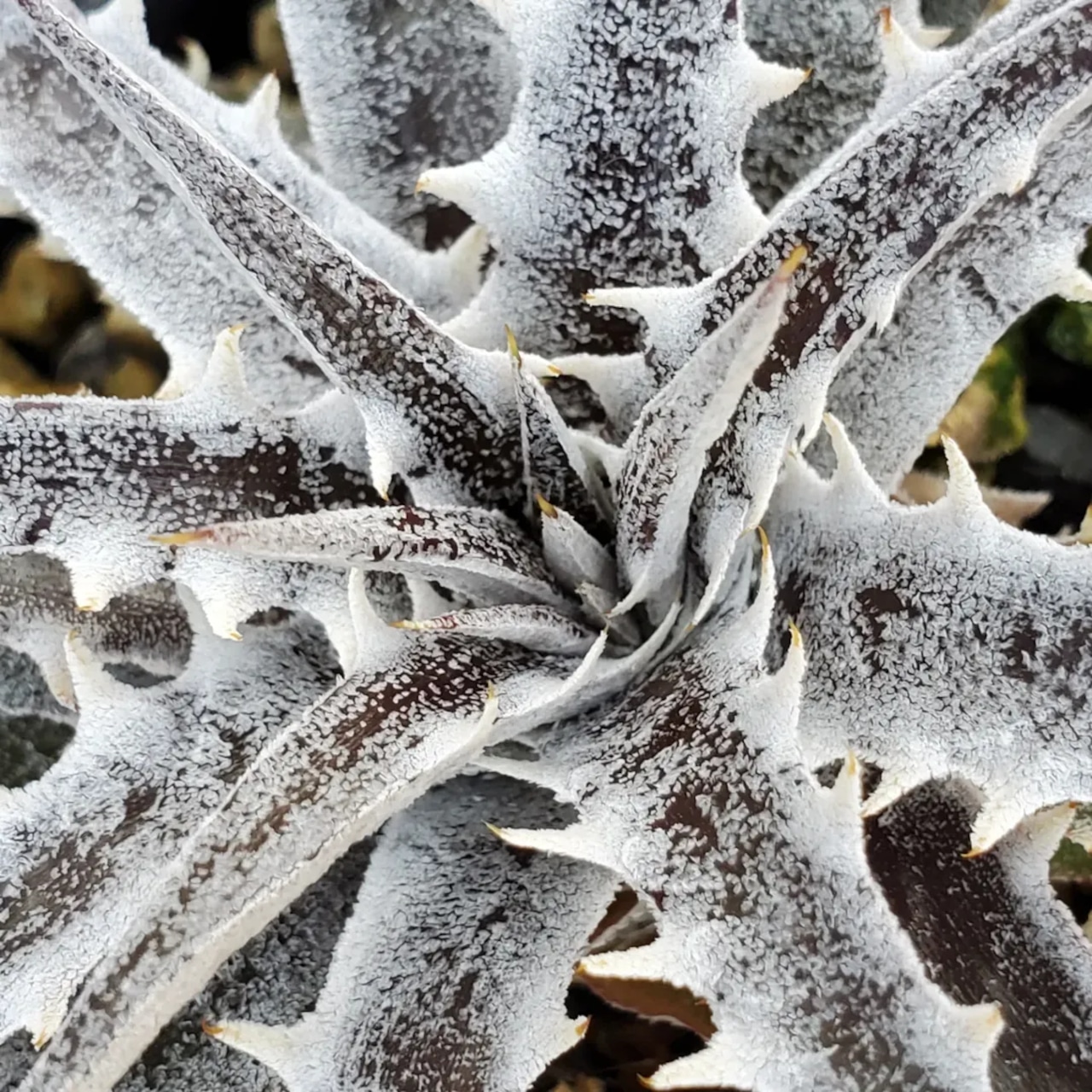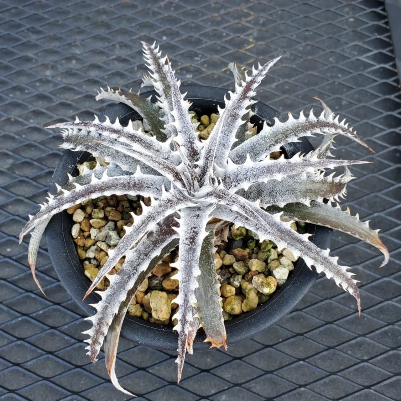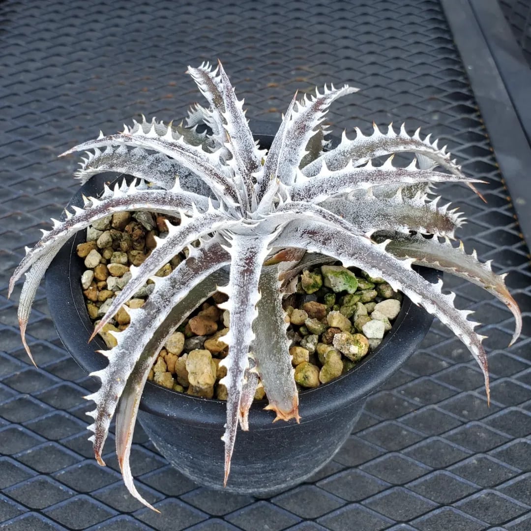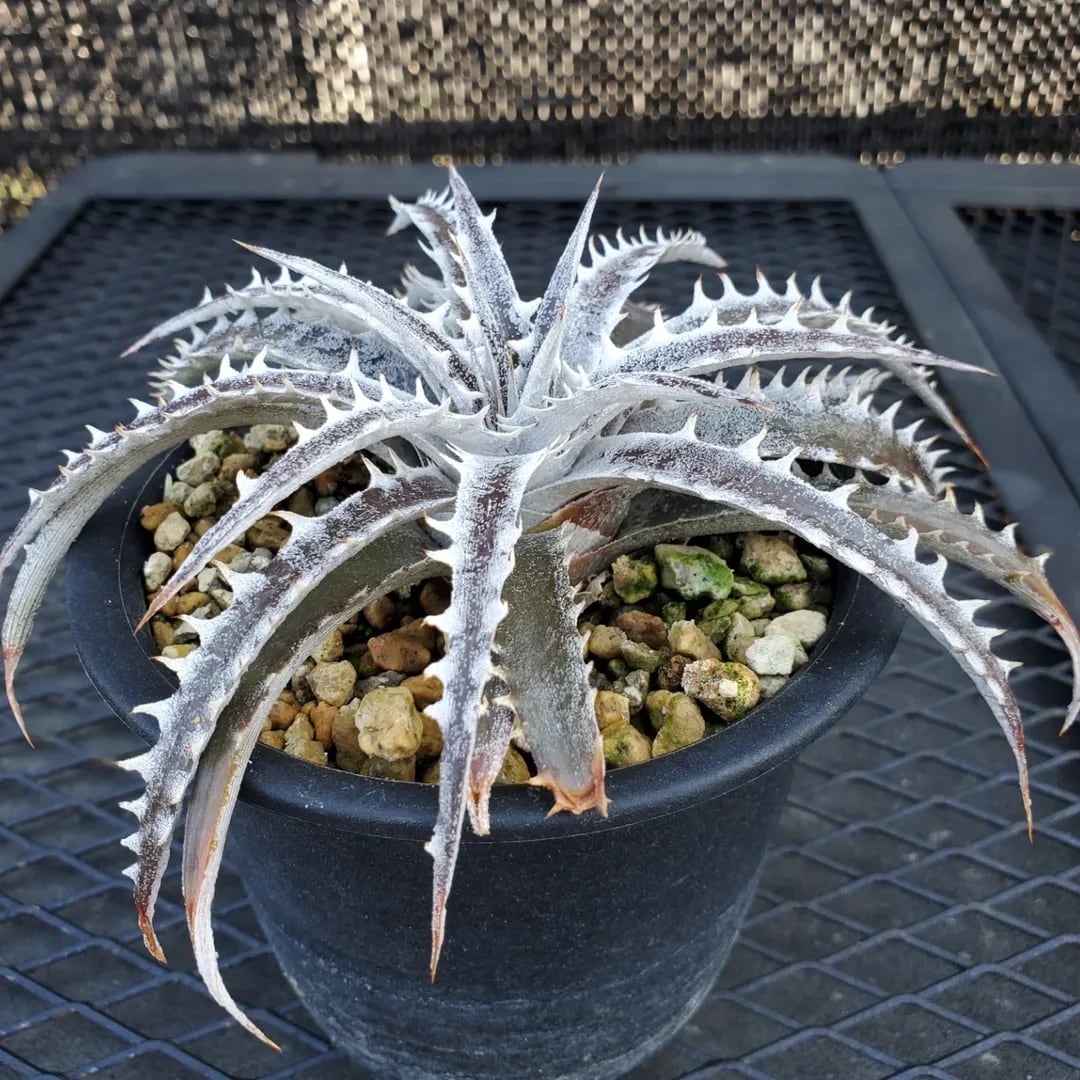 Q氏(Qdyckia)作出のハイブリッドです。鋸歯(Spine)が無いツルツルの葉が出たかと思えば、別の葉では鋸歯が出たりと、不規則に成長する、不思議な品種です。(撮影日:2026年03月08日)