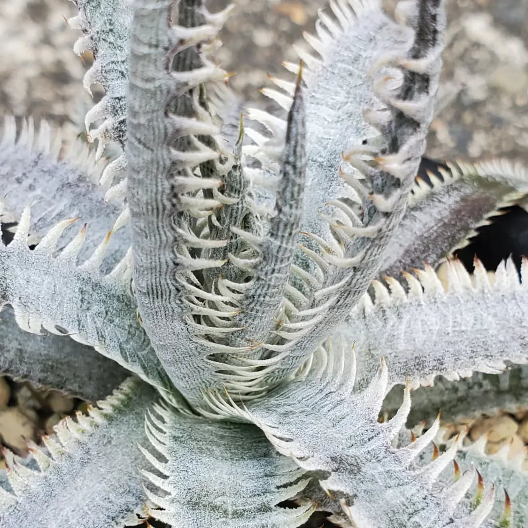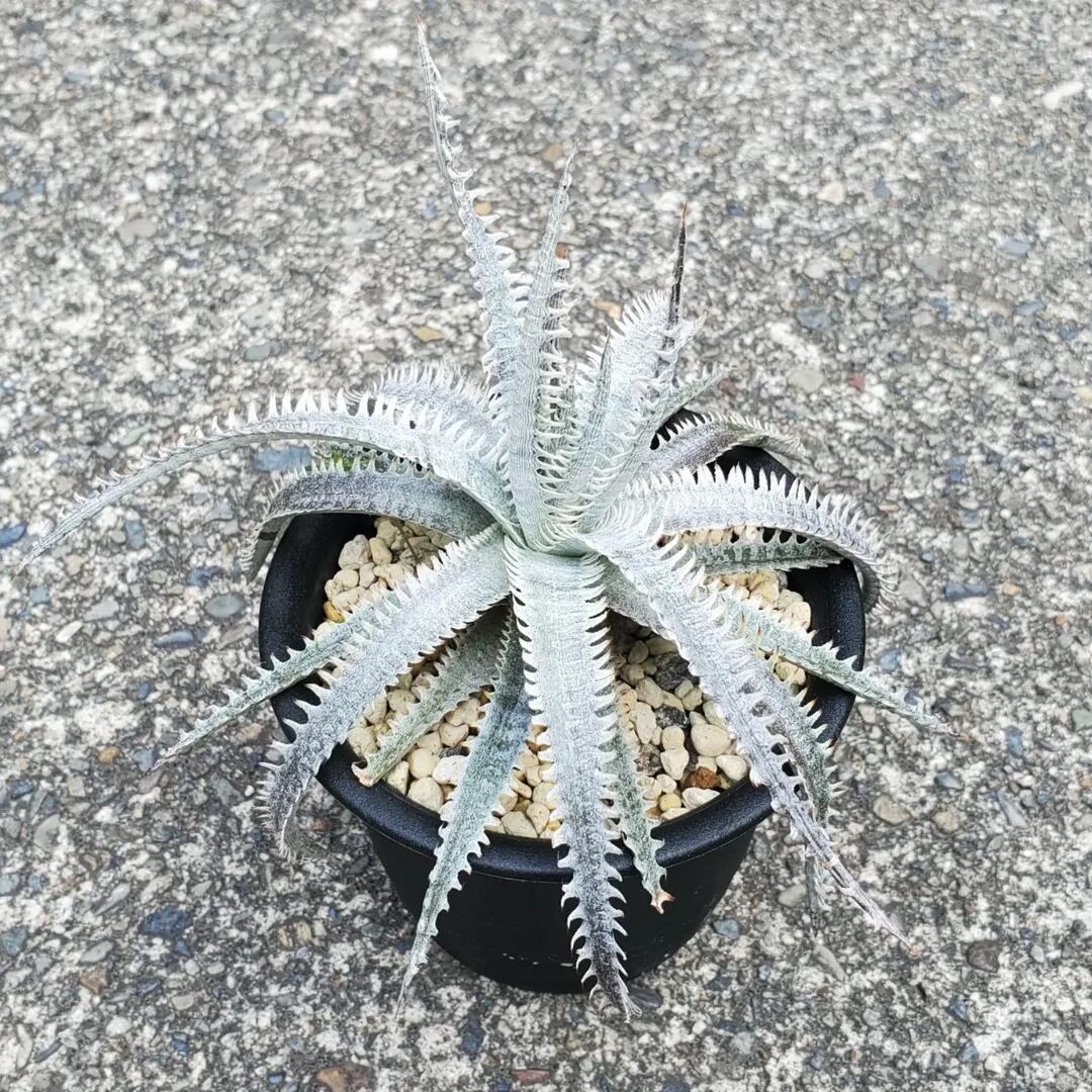 BSI登録の、タイのSueb氏のハイブリッドです。Sueb氏が作出した中でも、最も有名で、多くの交配に使われています。成長すると、トリコームで全体的に白くなり、細かいヒダのような独特の形状の鋸歯が、強烈な個性を放ちます。ディッキアファンなら一度は育ててほしい、素晴らしい品種です。(撮影日:2025年10月10日)画像2、3はNNNにある参考親株です。