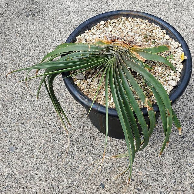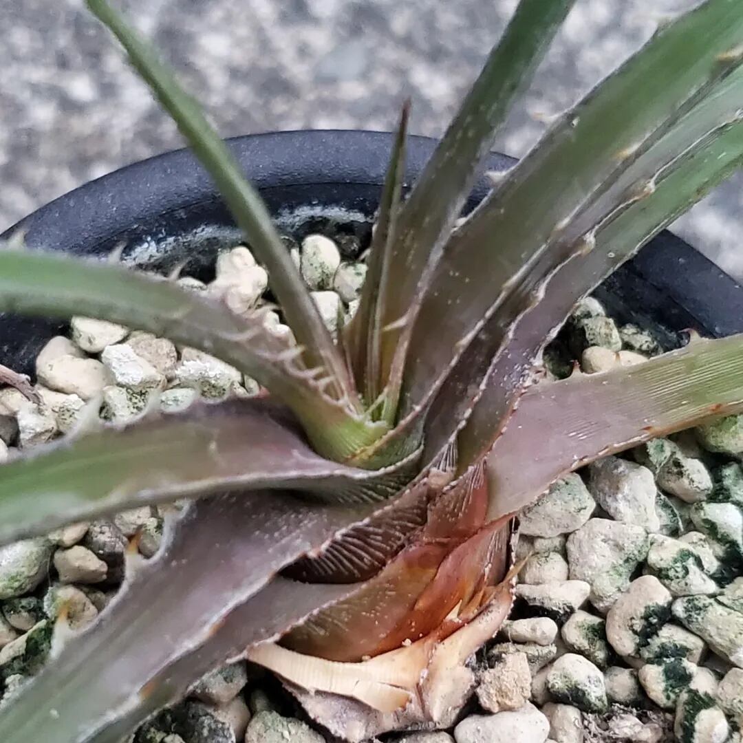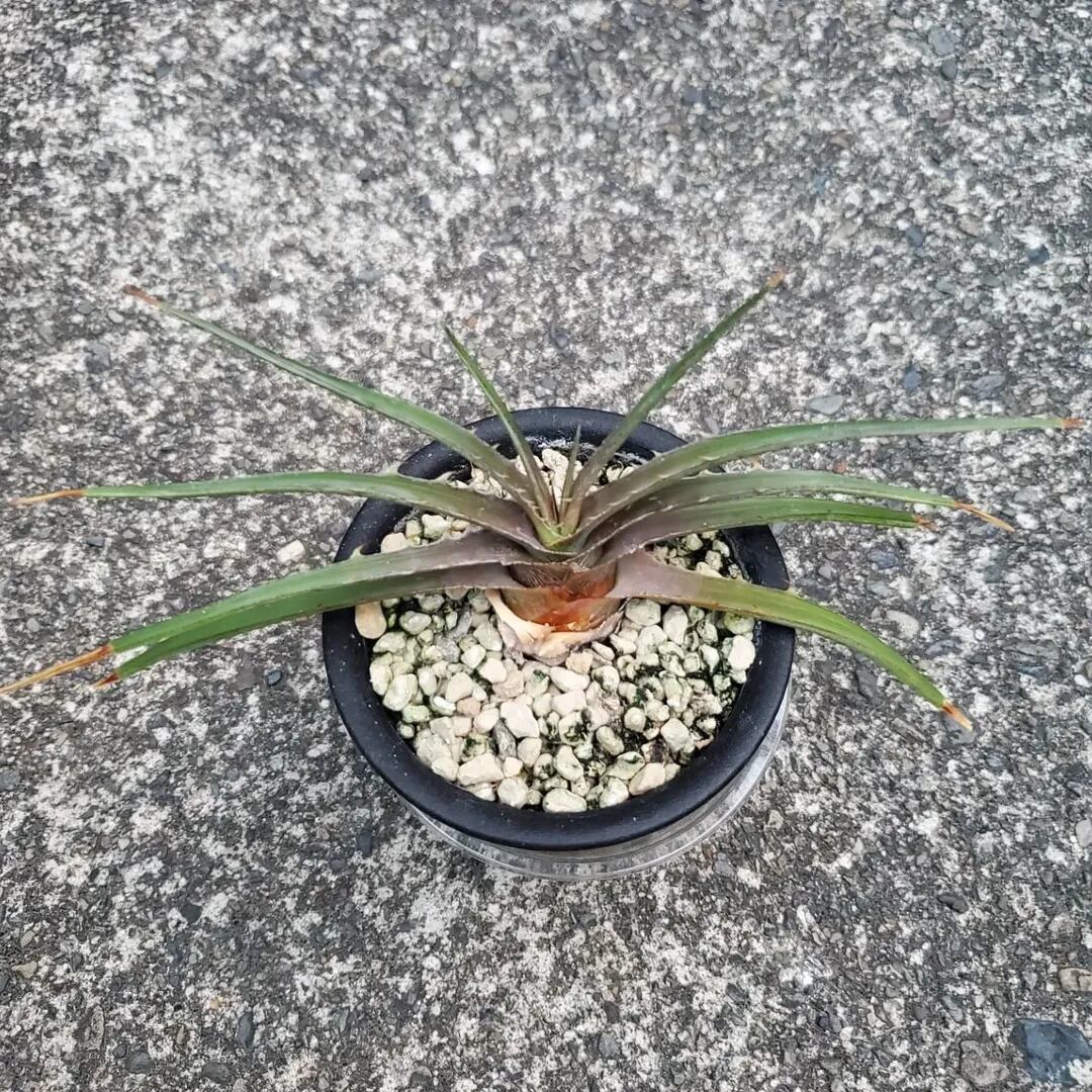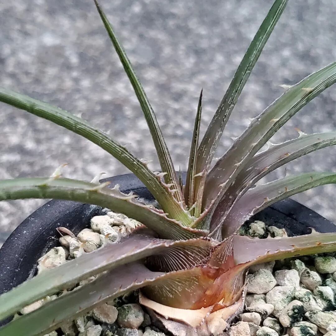 二列互生という扇のような形に展開する原種ディッキアです。NNN(ニンニンナーセリーズ)のコレクションで、001という管理番号の付いたタイプの子株になります。(撮影日:2025年07月27日)画像2、3は実際の親株で、販売株はこの親株から採れた子株になります。