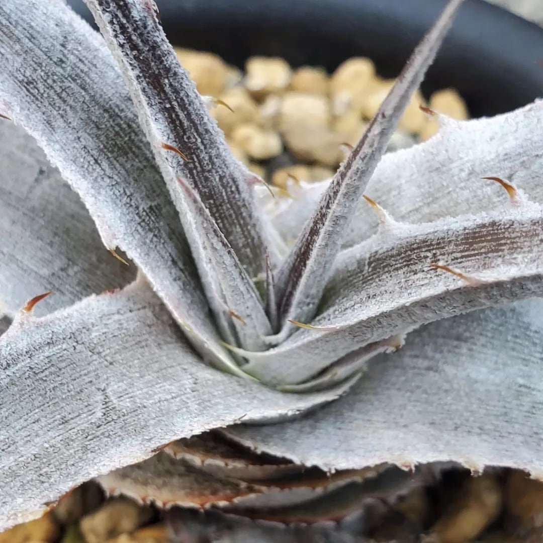 原種pottiorumに似た雰囲気のディッキアです。育成環境や成長段階にもよりますが、二列互生で扇のように成長します。pottiorumのWhiteよりもコンパクトで、地面に寝るような形で二列互生で整いやすい印象です。流通量の少ない、レアな品種です。(撮影日:2025年08月19日)