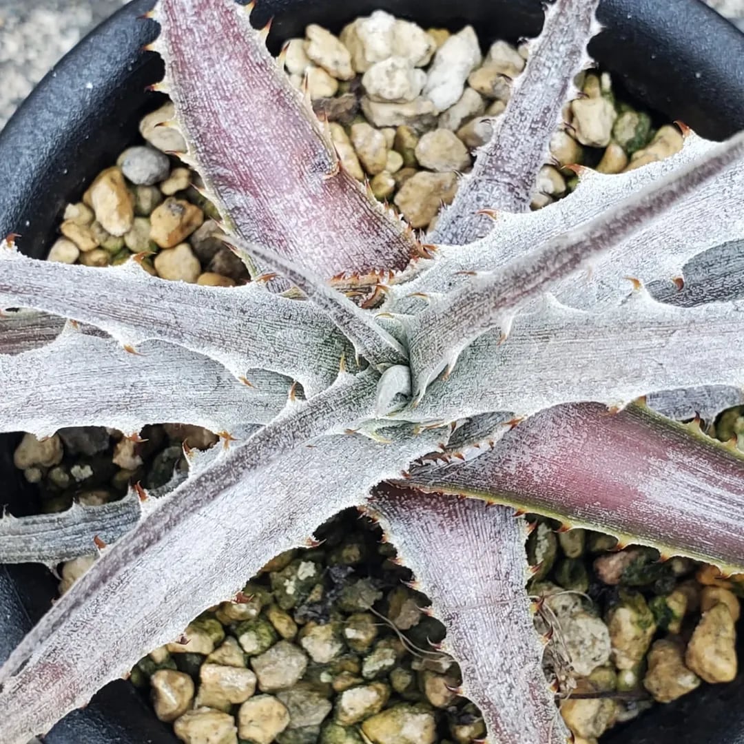 ディッキアの中では珍しい姿に育つpottiorumという原種ディッキアです。複数のタイプが確認されていますが、この個体は色味はトリコームで白くなるWhiteと呼ばれるタイプに近いですが、Whiteよりもグレーに近い印象で、またWhiteほど大型化せず、Rubraと呼ばれるタイプに近いサイズ感になります。育成環境や成長段階にもよりますが、旋回してロゼット状に成長するよりも、二列互生で扇のように成長する可能性が高いです。(撮影日:2025年08月19日)