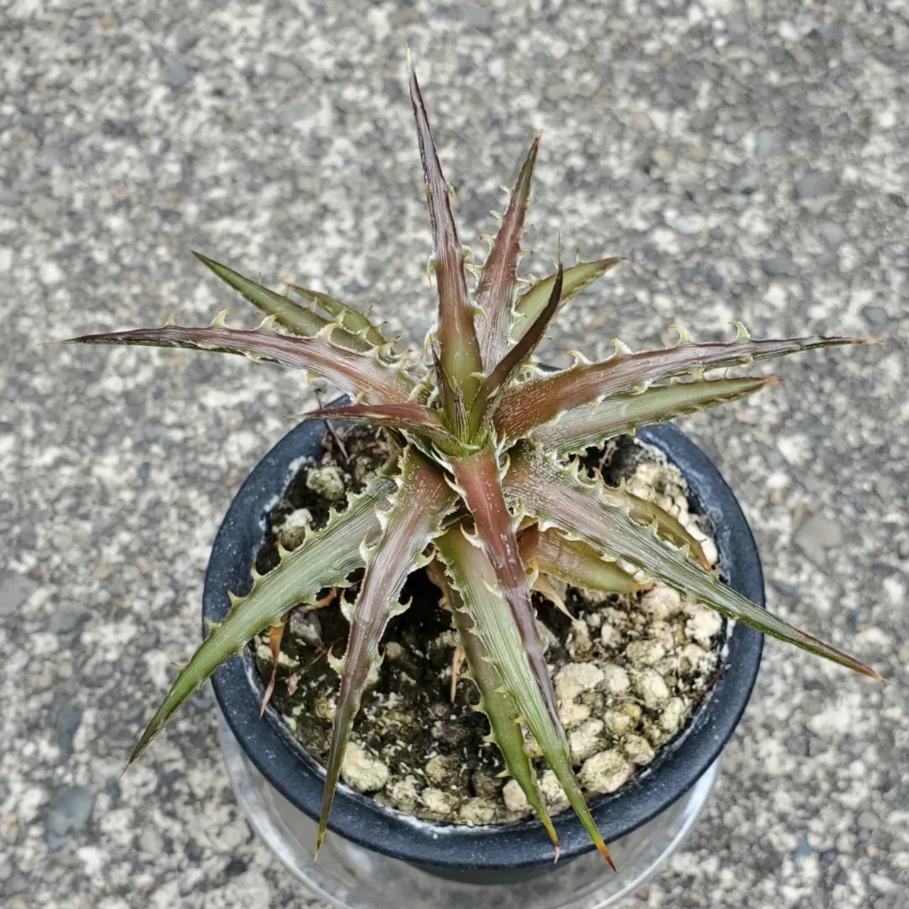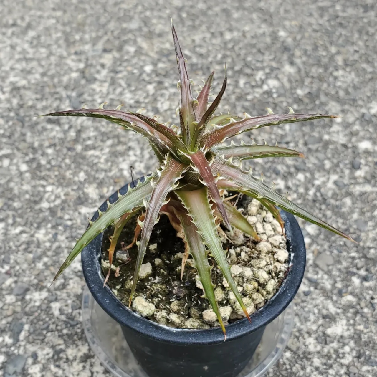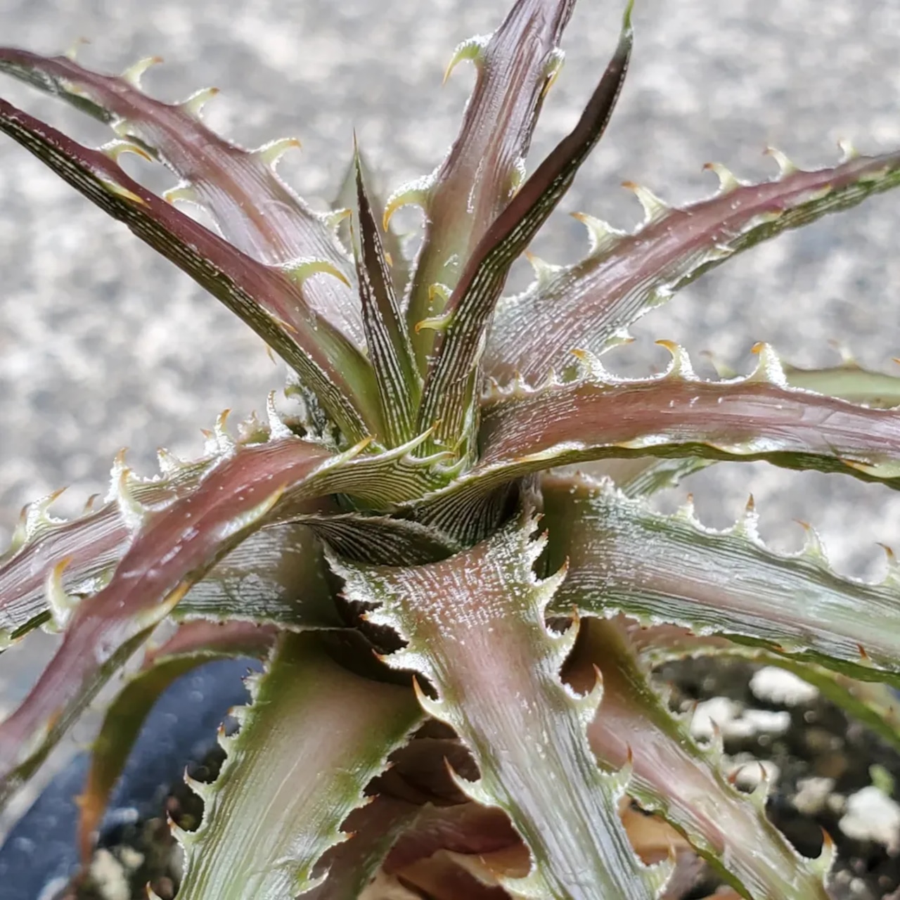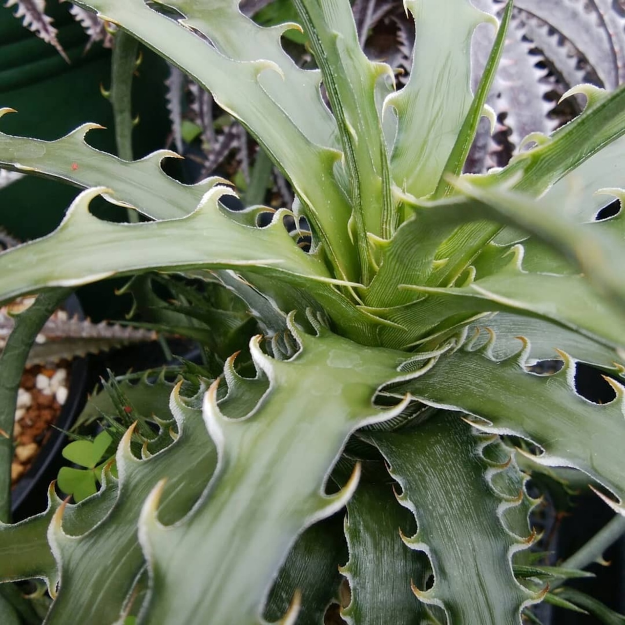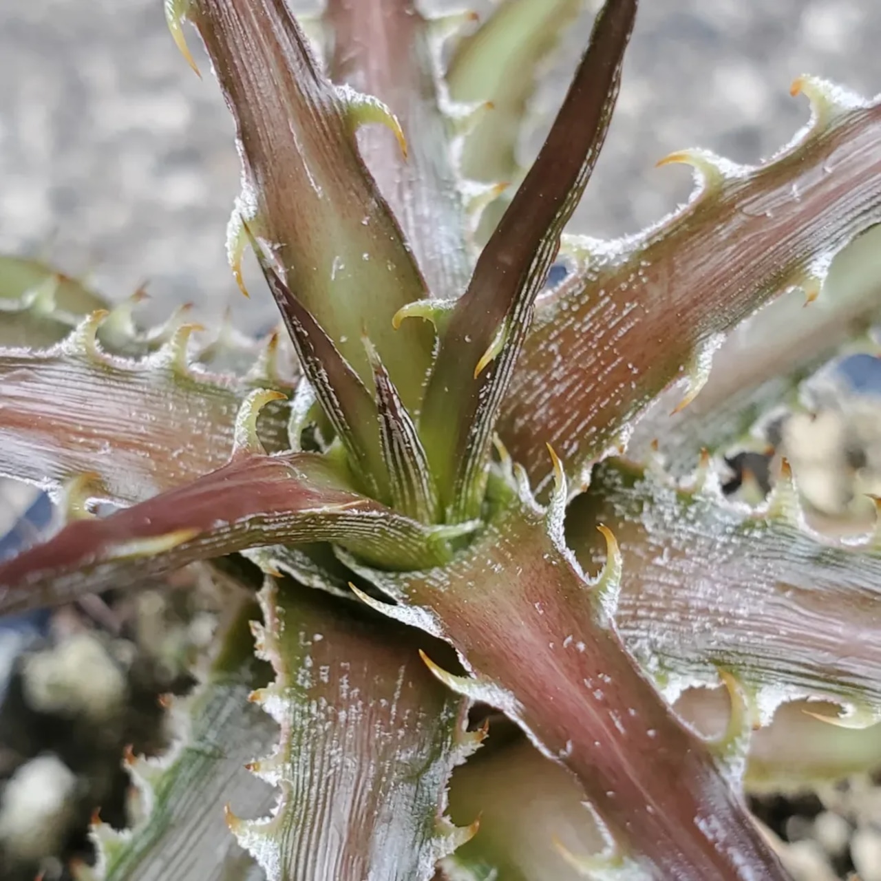 日本の刺毒植物狂氏による、ディッキアとエンコリリウムの異属間ハイブリッドです。交配はDyckia goehringii x Encholirium horridumになります。それぞれの親の良さを混ぜ合わせたような素晴らしい品種です。画像2、3は実際の親株で、販売株はこの親株から採れた子株になります。(撮影日:2025年09月30日)