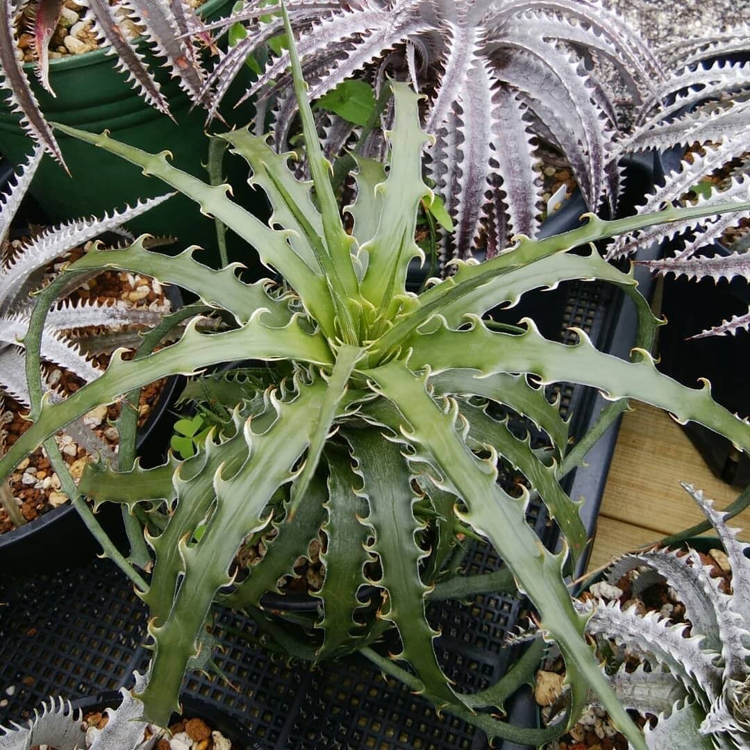 日本の刺毒植物狂氏による、ディッキアとエンコリリウムの異属間ハイブリッドです。交配はDyckia goehringii x Encholirium horridumになります。それぞれの親の良さを混ぜ合わせたような素晴らしい品種です。画像2、3は実際の親株で、販売株はこの親株から採れた子株になります。(撮影日:2025年10月20日)