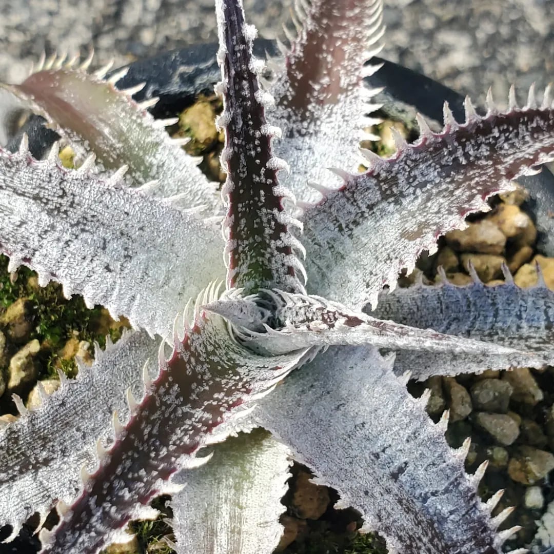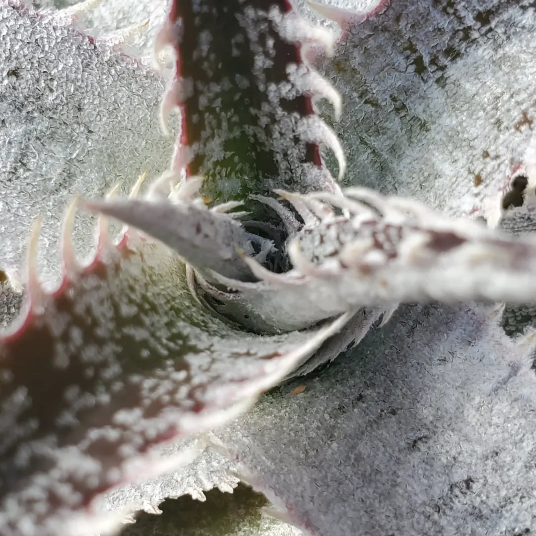 ディッキアの交配で有名な、故・ビル・ベイカー氏の名前が付けられたハイブリッドです(作出者は不明)。赤紫の地肌にかすれたようなトリコームと細かい鋸歯が特徴の、渋いハイブリッドです。交配に使うと、面白い鋸歯の子が出やすいことでも知られており、マニアの方々にも人気があります。画像2、3は実際の親株で、販売株はこの親株から採れた子株になります。(撮影日:2025年10月09日)