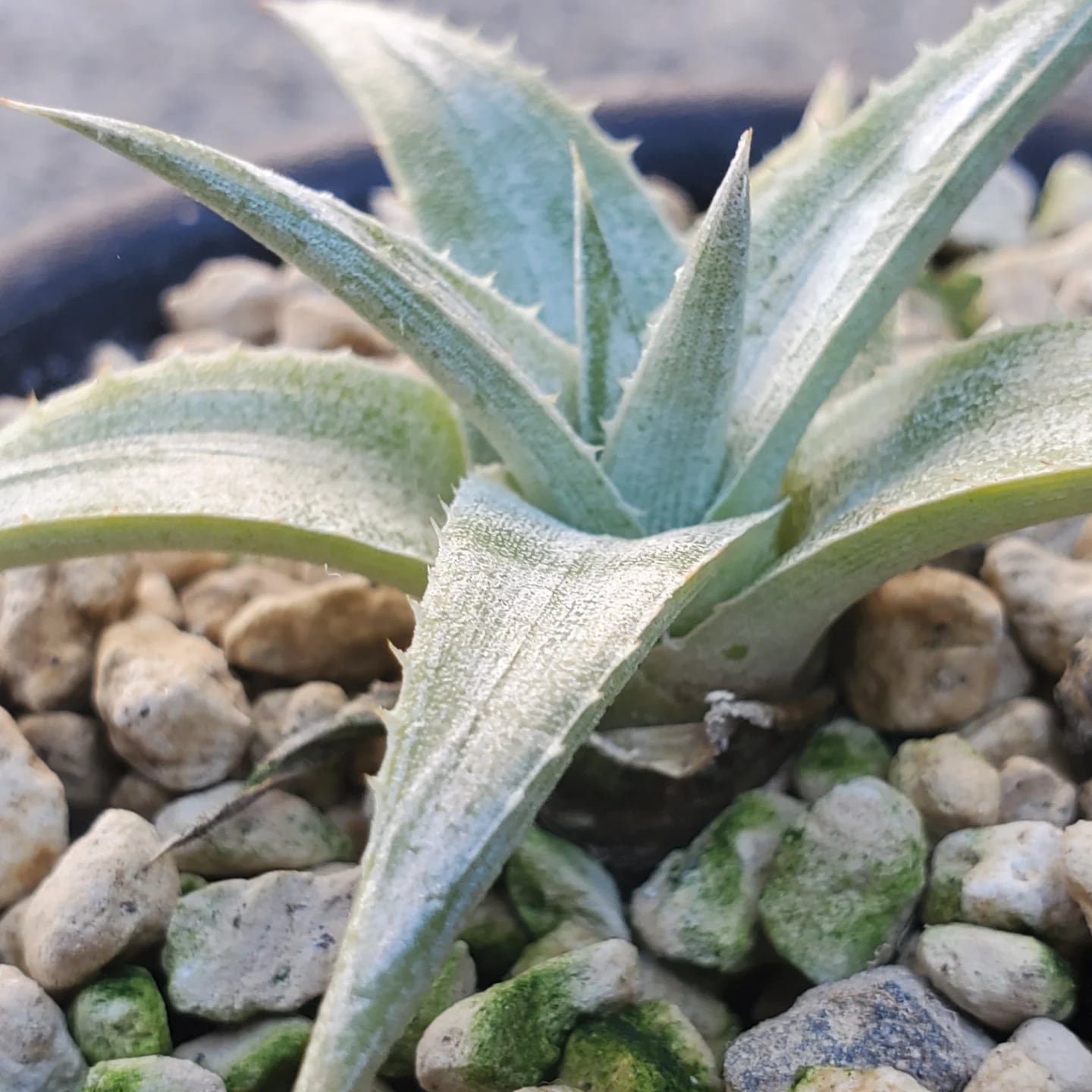 Bill Baker氏作出のハイブリッドです。葉にシマシマのゼブラ模様が出ることで知られている品種になります。シマ模様は、育成環境などによって濃さが変化したり、ほとんど出ない場合もあり、かなり差異があります。コンパクトで、三角の太葉が規則的に並び、葉姿の美しさも楽しむことができるディッキアです。(撮影日:2026年01月10日)画像2、3は、Panusさんから提供していただいた、タイの親株の画像になります。