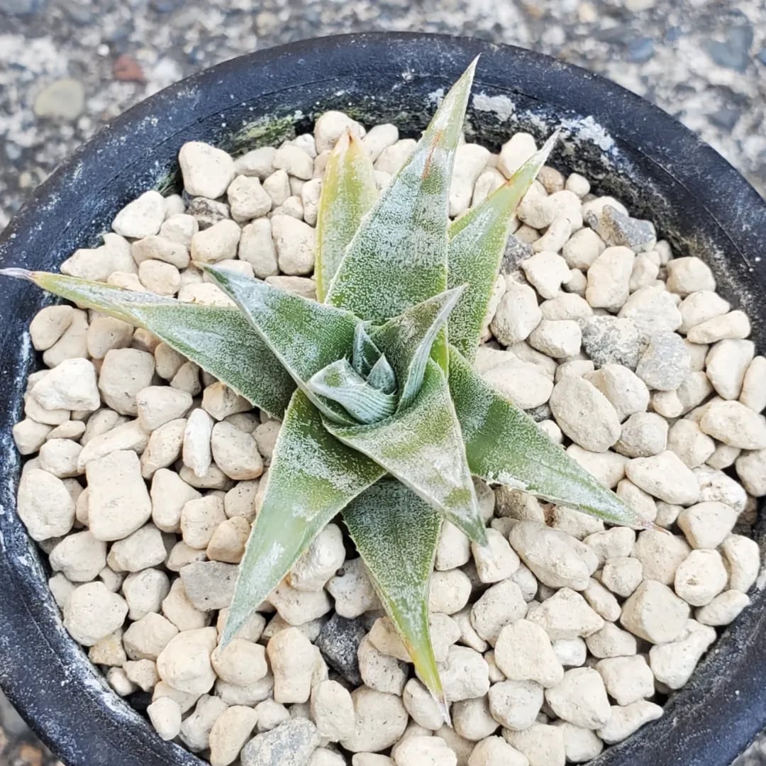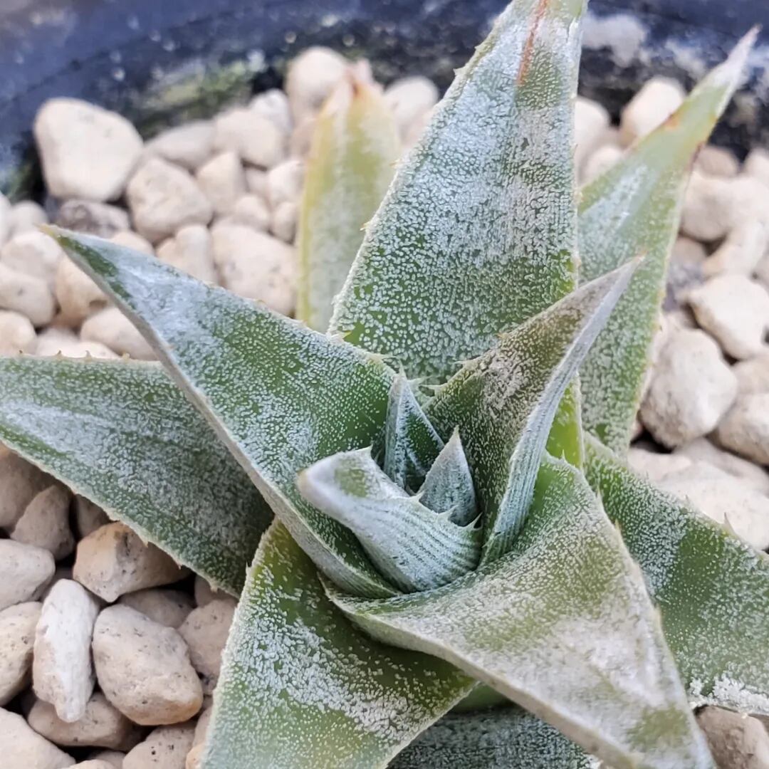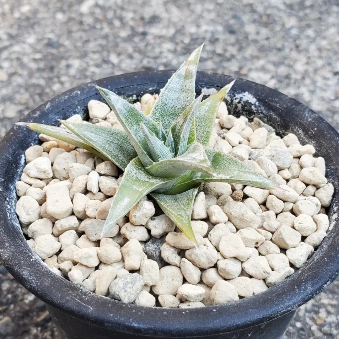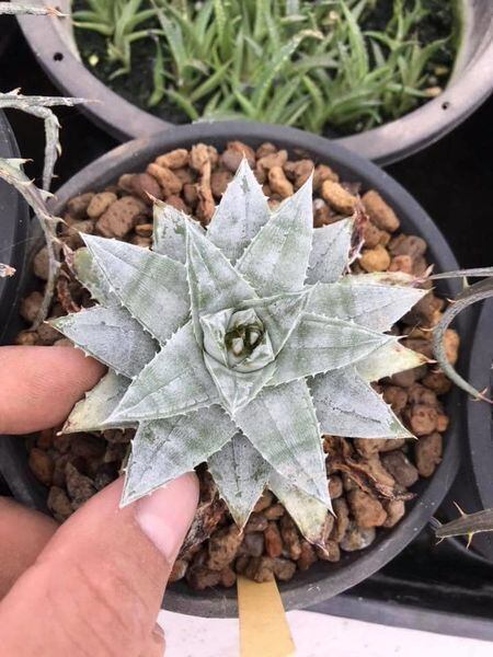 Bill Baker氏作出のハイブリッドです。葉にシマシマのゼブラ模様が出ることで知られている品種になります。シマ模様は、育成環境などによって濃さが変化したり、ほとんど出ない場合もあり、かなり差異があります。コンパクトで、三角の太葉が規則的に並び、葉姿の美しさも楽しむことができるディッキアです。(撮影日:2026年02月05日)画像2、3は、Panusさんから提供していただいた、タイの親株の画像になります。