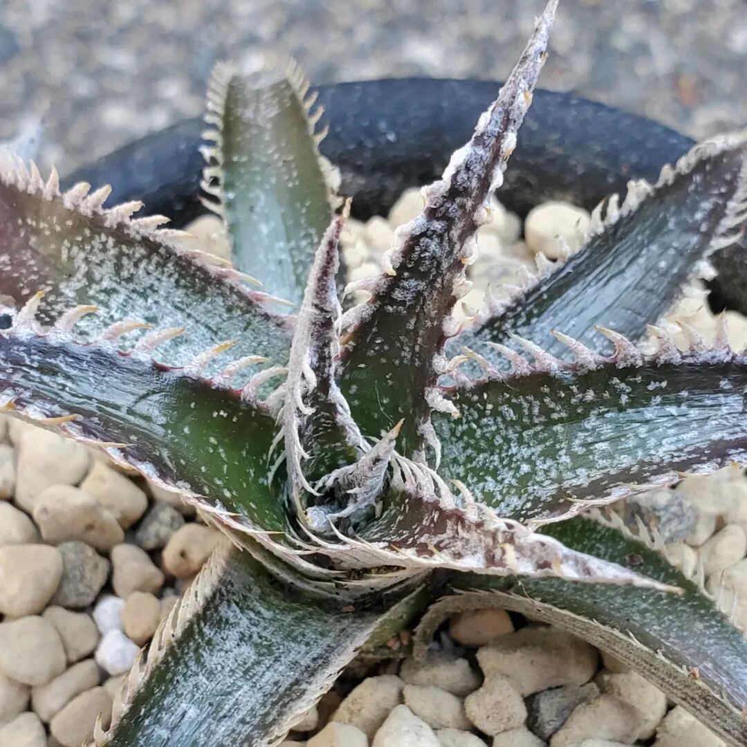 ディッキアの交配で有名な、故・ビル・ベイカー氏の名前が付けられたハイブリッドです(作出者は不明)。赤紫の地肌にかすれたようなトリコームと細かい鋸歯が特徴の、渋いハイブリッドです。交配に使うと、面白い鋸歯の子が出やすいことでも知られており、マニアの方々にも人気があります。画像2、3は実際の親株で、販売株はこの親株から採れた子株になります。(撮影日:2026年02月14日)