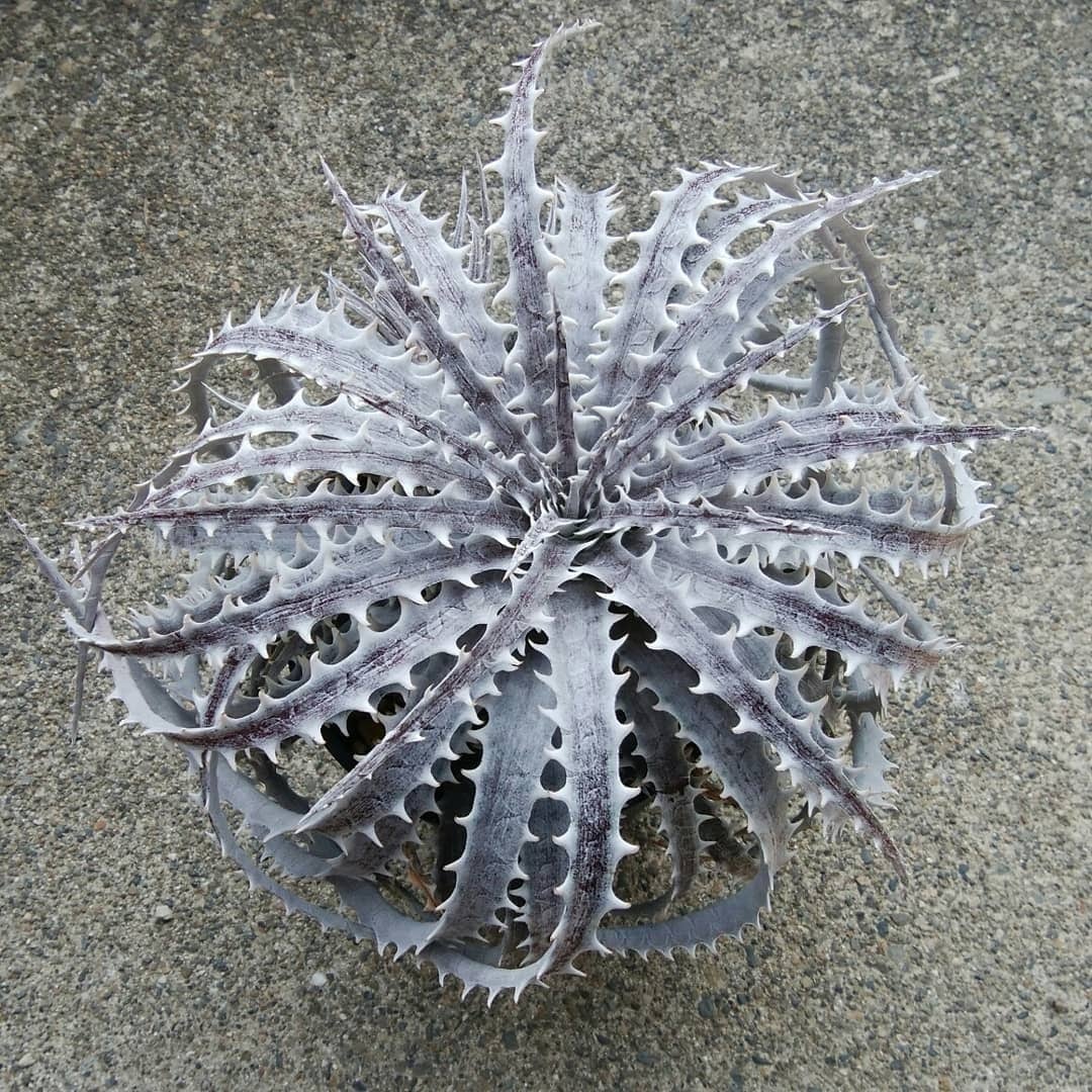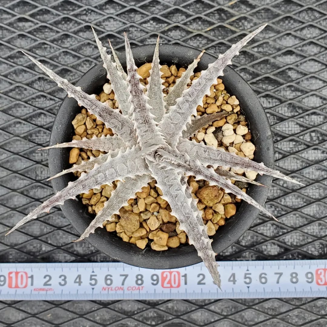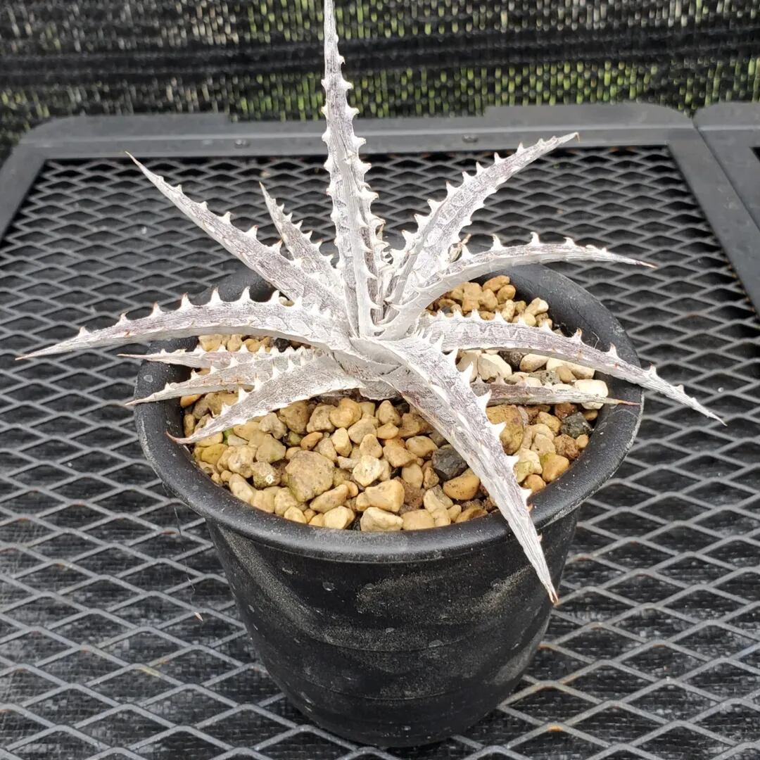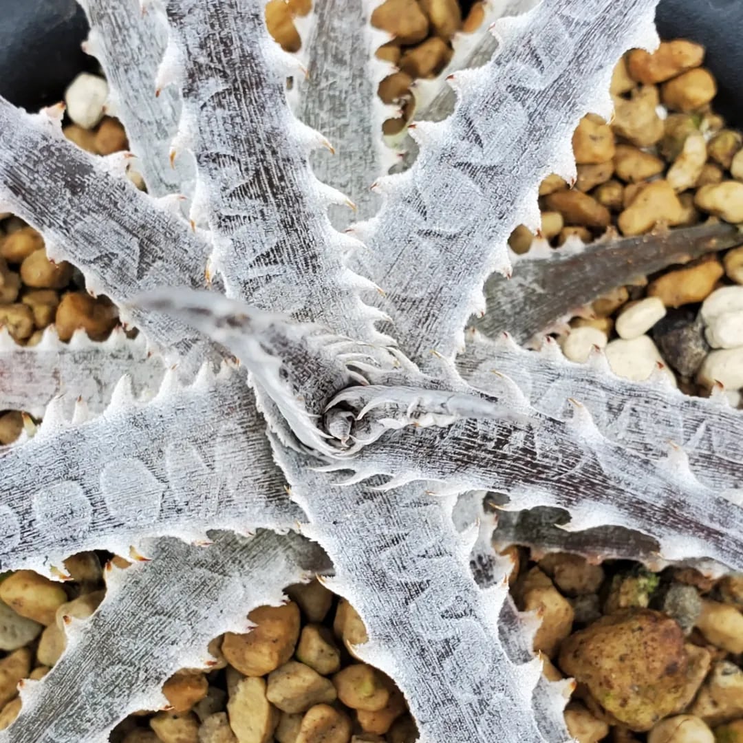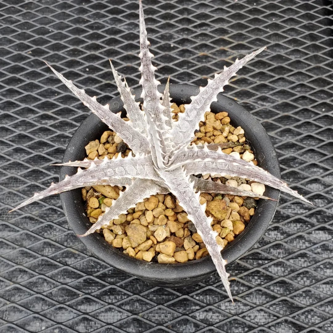 交配などにもよく使われる、Q氏(Qdyckia)作出のハイブリッドです。コーティングのようなトリコームにより白~ライトグレーの色味が出て、とても美しい品種です。ロゼット状に展開し、迫力のある大きめの鋸歯が出ます。画像2は実際の親株で、販売株はこの親株から採れた子株になります。(撮影日:2026年04月5日)