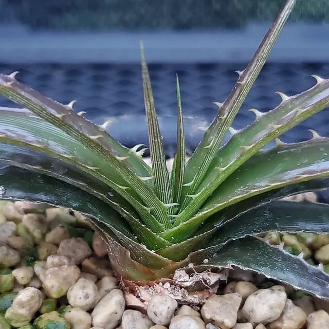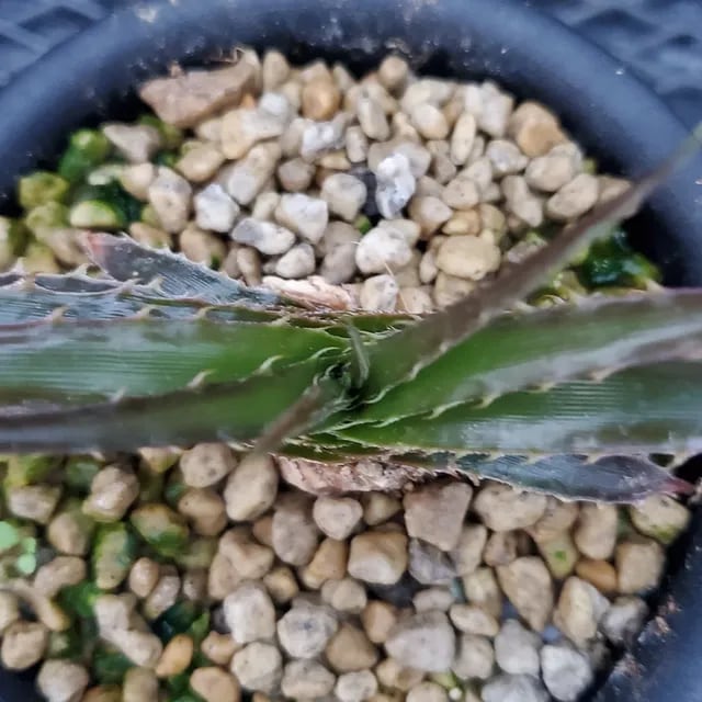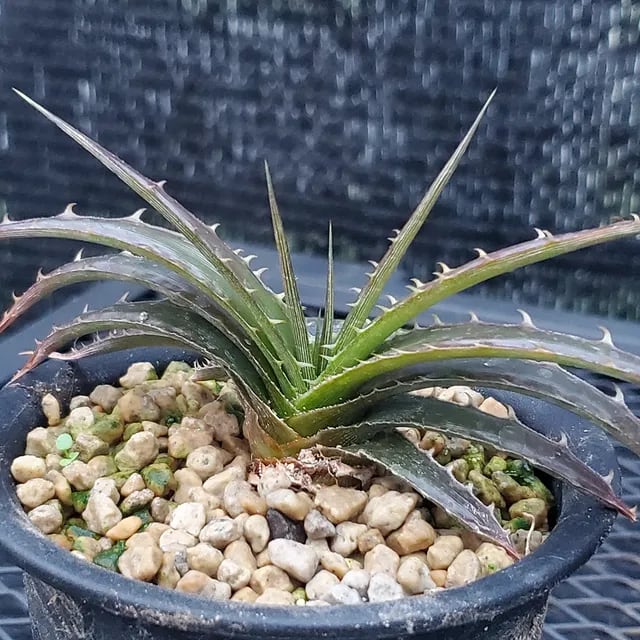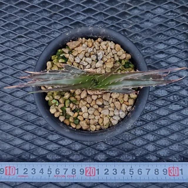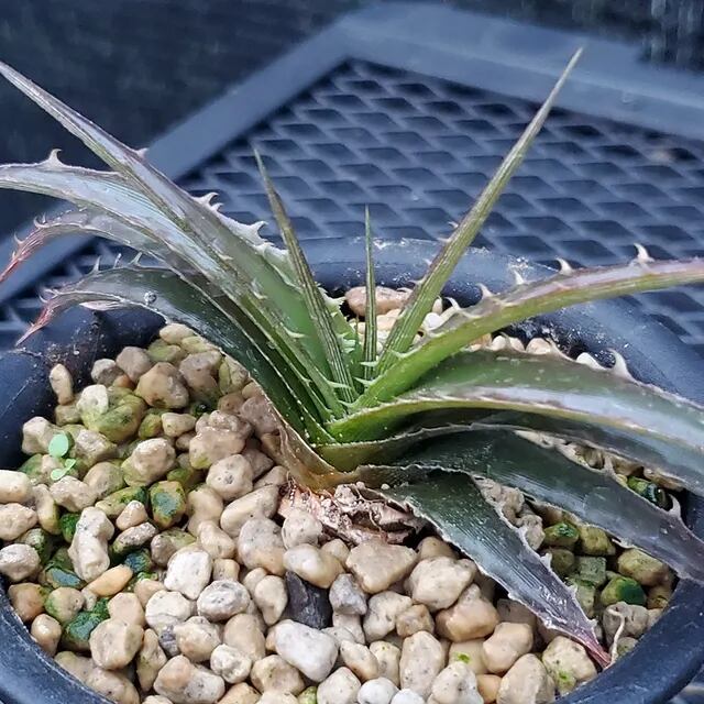二列互生という扇のような形に展開する原種ディッキア、エステベシーのハイブリッドで、まさにコンパクトなエステベシーという姿です。交配等詳細は不明です。このサイズでほぼ親株で、子株を出します。非常に成長が遅い印象です。(撮影日:2026年04月19日)