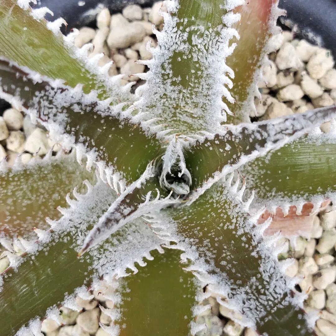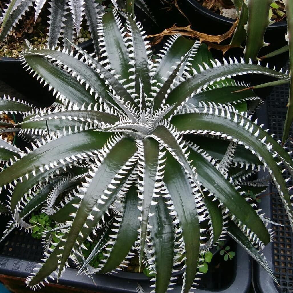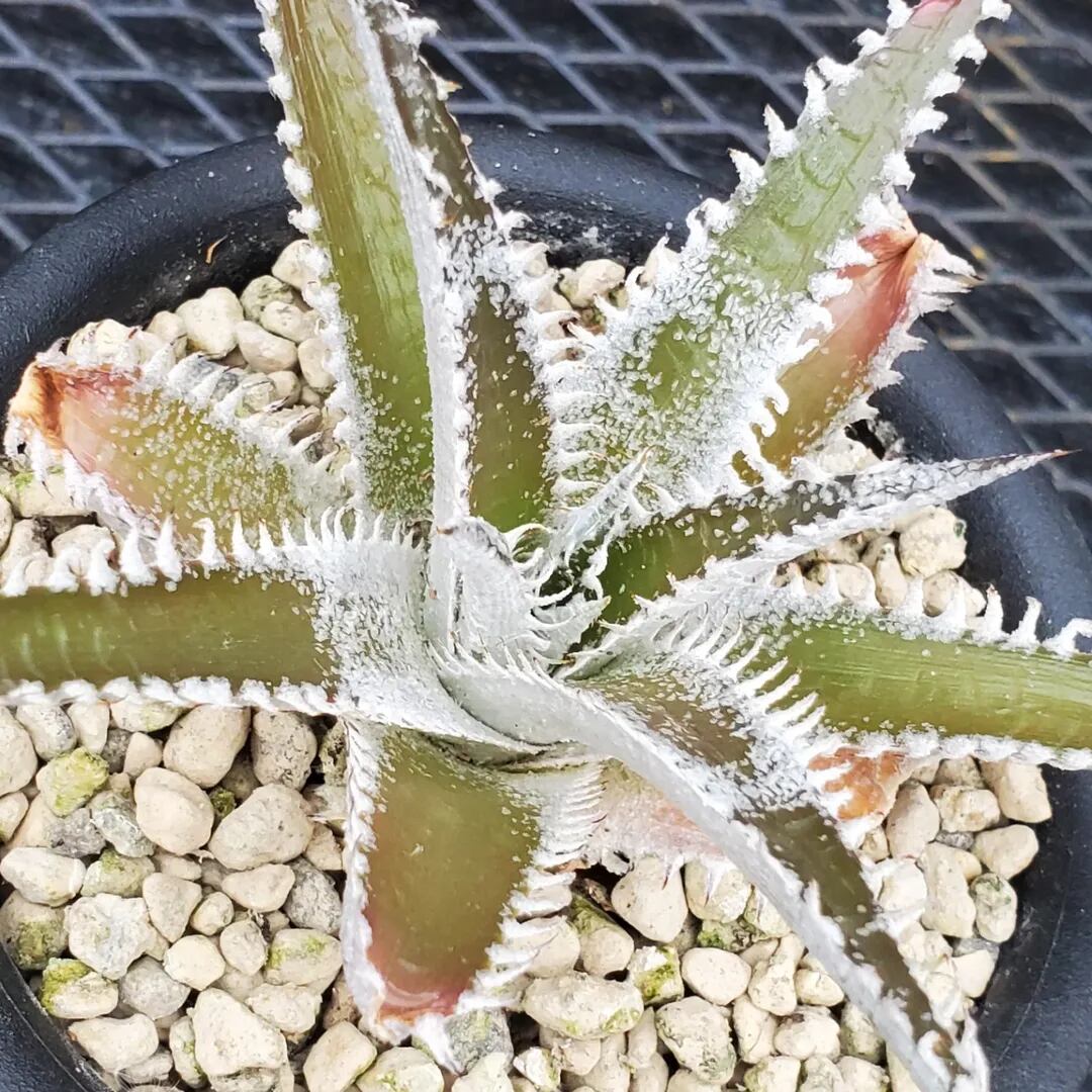 Bill Baker氏作出のハイブリッドです。ディッキアのハイブリッドの中では、かなり前から存在する品種で、緑地のツヤ葉に、白く細かい鋸歯が連続して並び、とても美しい品種です。‘Tarzan’:ターザンという品種名と、‘Tarzana’:タルザナという品種名の二つの名前で流通しており、それぞれが別種なのかどうか、どちらが‘Tarzan’:ターザンで、どちらが‘Tarzana’:タルザナなのかについては諸説あり、未だに明確にはなっていません。本株に関しても、どちらにあたるのか、正確にはわかりませんので、両方の名前を併記して販売させていただきます。(撮影日:2026年04月26日)画像2は実際の親株で、販売株はこの親株から採れた子株になります。