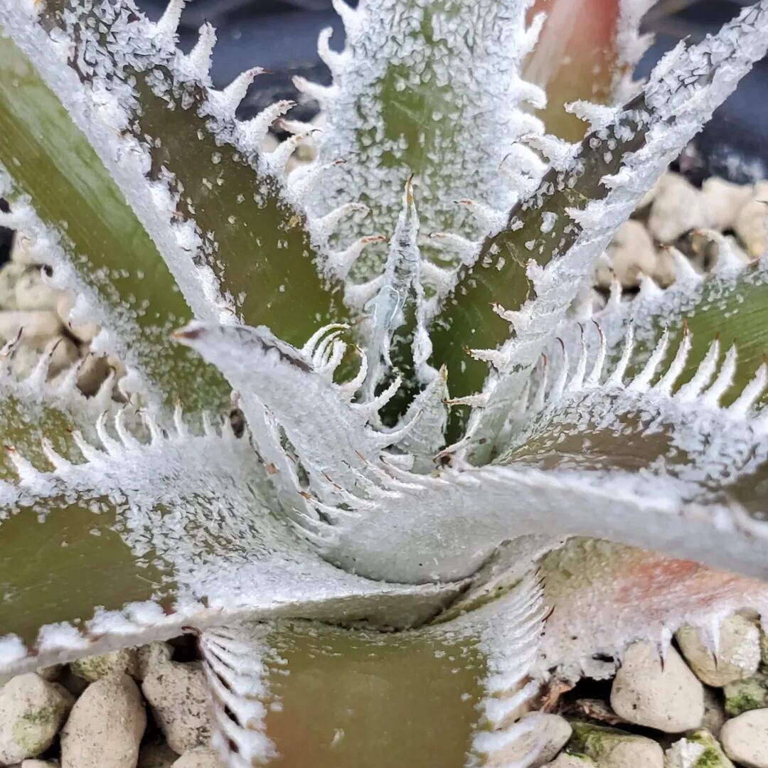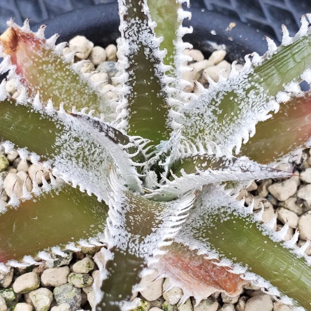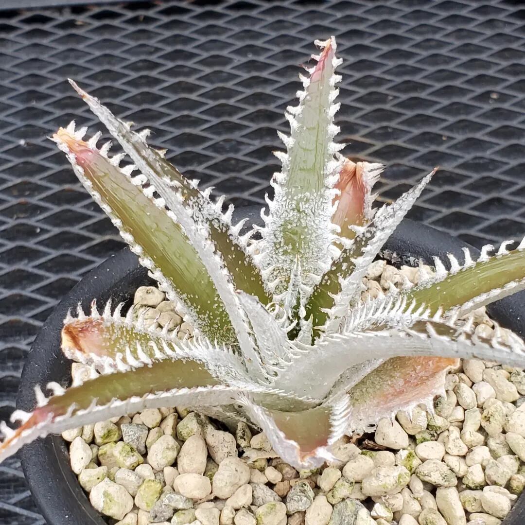 Bill Baker氏作出のハイブリッドです。ディッキアのハイブリッドの中では、かなり前から存在する品種で、緑地のツヤ葉に、白く細かい鋸歯が連続して並び、とても美しい品種です。‘Tarzan’:ターザンという品種名と、‘Tarzana’:タルザナという品種名の二つの名前で流通しており、それぞれが別種なのかどうか、どちらが‘Tarzan’:ターザンで、どちらが‘Tarzana’:タルザナなのかについては諸説あり、未だに明確にはなっていません。本株に関しても、どちらにあたるのか、正確にはわかりませんので、両方の名前を併記して販売させていただきます。(撮影日:2026年04月26日)画像2は実際の親株で、販売株はこの親株から採れた子株になります。