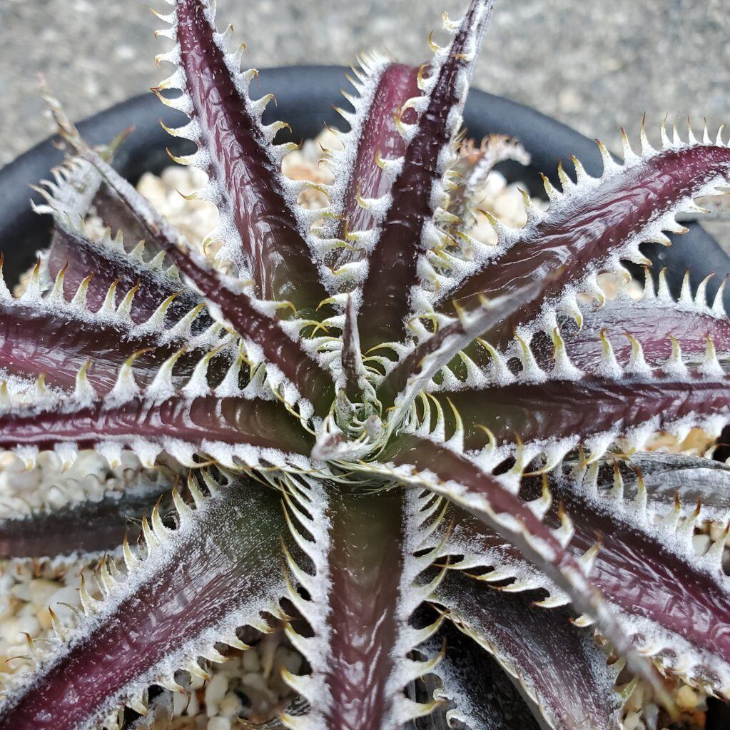 タイのSueb氏のハイブリッドです。成長すると、赤紫のツヤのある地肌に、先がかなり細長く伸びる白い鋸歯が連なります。鋸歯の先端は黄色く染まり、とても美しい姿になります。(撮影日:2021年6月24日)画像2、3は実際の親株で、販売株はこの親株から採れた子株を育成したものになります。