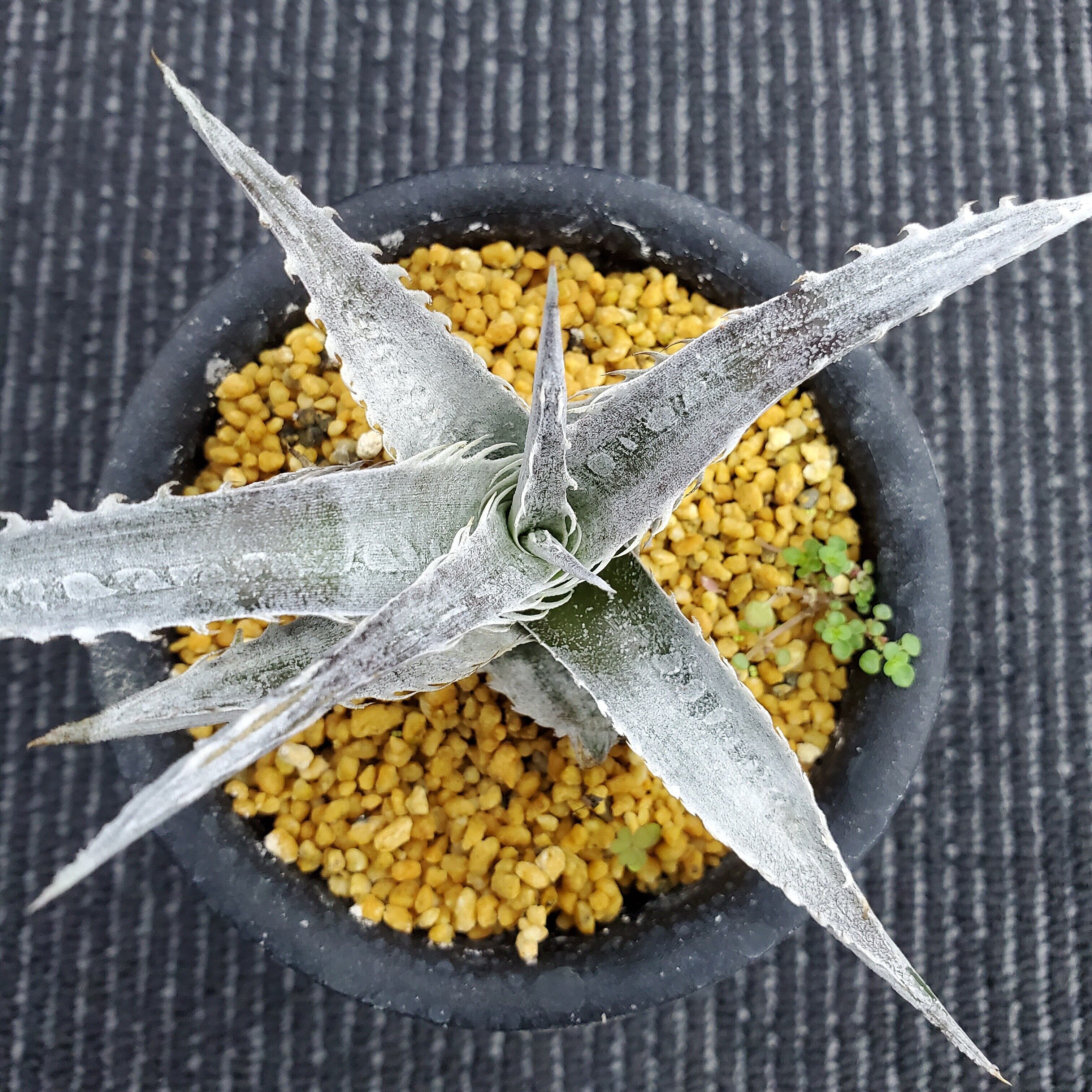 Constantino氏作出の、真っ白で、流れるような鋸歯とうねる姿が特徴的な、美しいハイブリッドです。トリコームの模様(ウォーターマーク)がハートマークに見えることがあります。Qdyckia株からの子株になります。(撮影日:2021年7月6日)画像2は実際の親株で、販売株はこの親株からの子株になります。