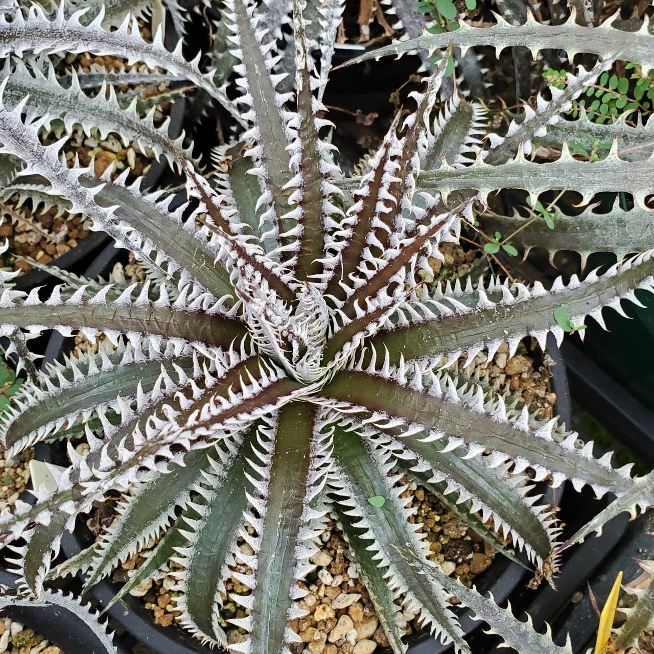 Panusのナンバー付き選抜ハイブリッドです。ツヤのある赤紫の地肌に、鎌のような角度のある白い鋸歯がビッシリと並び、大変インパクトの強い品種です。(撮影日:2023年6月24日)画像2、3は実際の親株で、販売株はこの親株から採れた子株になります。