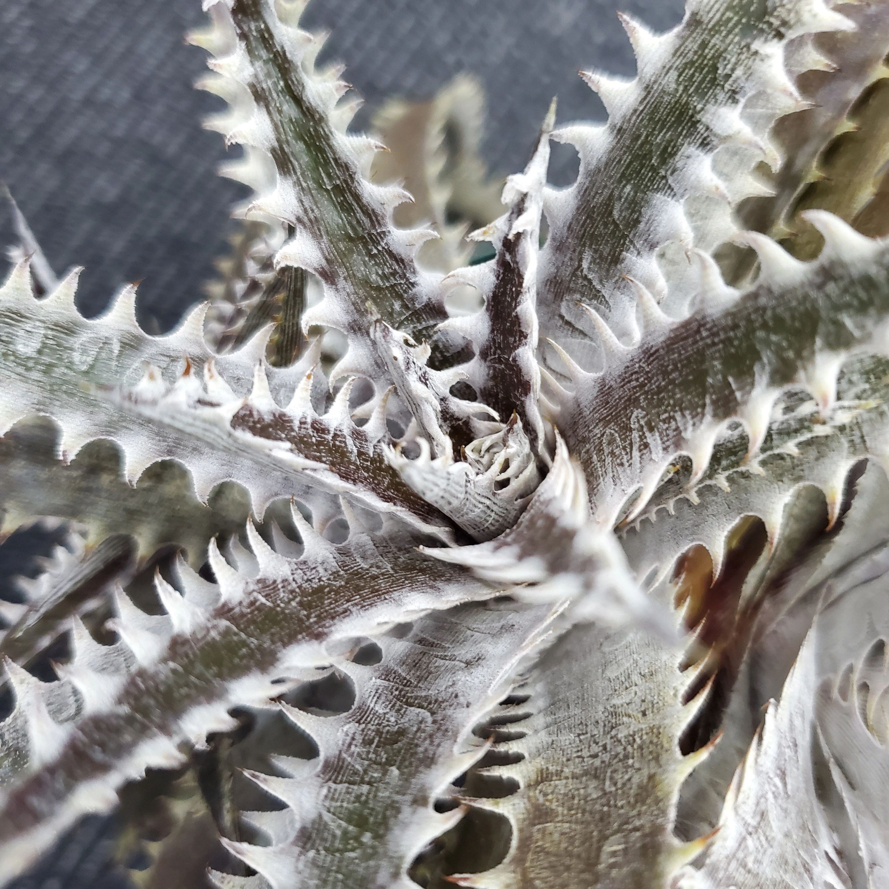 タイのPanusナーセリー産の株です。濃い紫色から黒に近い地肌に、白いトリコームがのった大きく鋭くフックする鋸歯が並ぶ、攻撃的な雰囲気が素晴らしいハイブリッドです。当店特選株になります。現在2分頭中で、すでに大きめの子株が2つ出てきています。サイズ感も葉数もあり、しっかり根の張った安定株です。(撮影日:2021年10月7日)