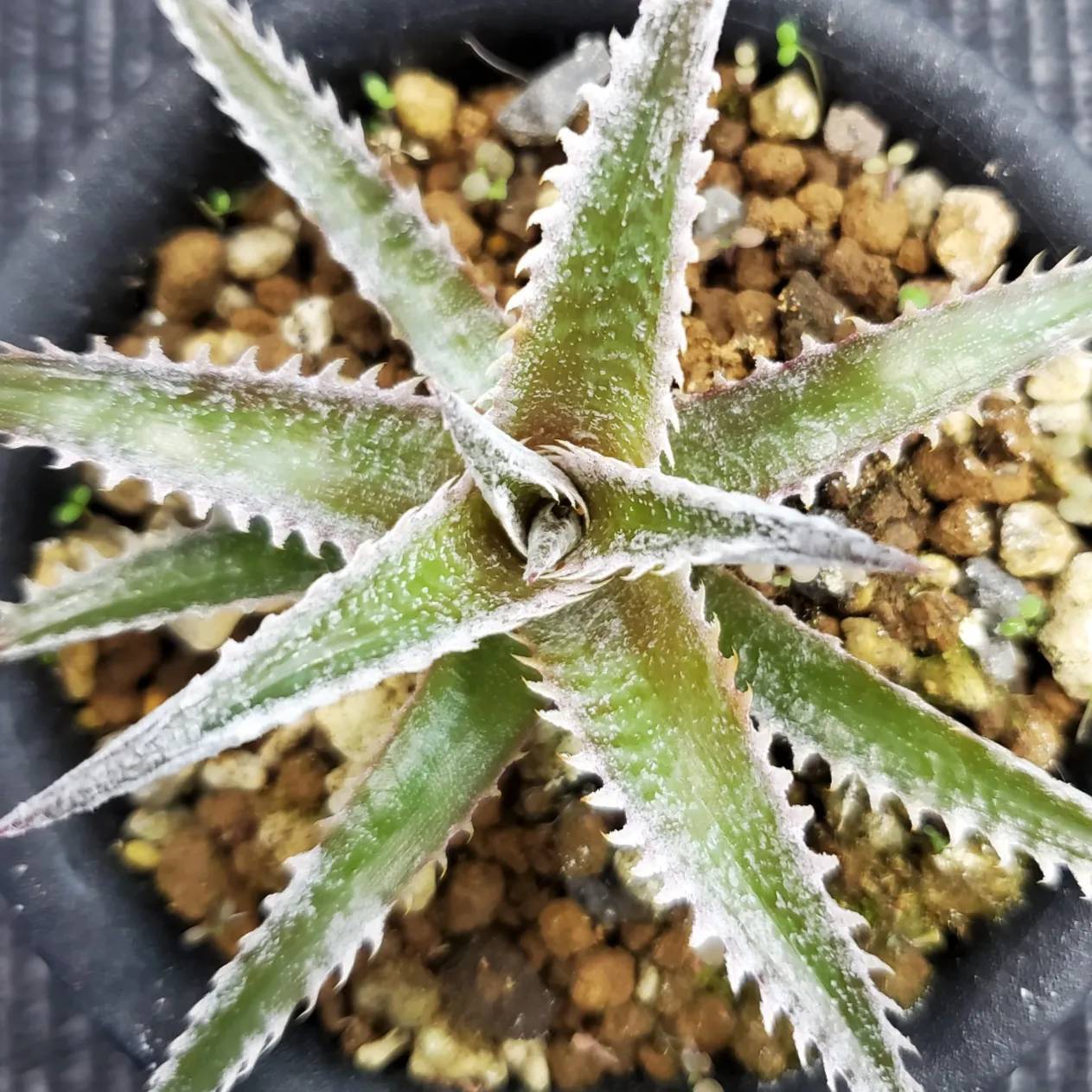 ディッキア界のレジェンドでもあるsunrainsoilさんとlithiumさんがコラボして交配させた、「LSシリーズ」の一つに、名前が付けられたものになります。複数の素晴らしい兄弟株が存在します。赤地の葉に白く連続した鋸歯が並び、鋸歯から葉の縁取り部分にかけてトリコームが入り、美しい姿に成長します(撮影日:2022年4月12日)画像2、3は実際の親株で、販売株はこの親株から採れた子株になりますが、この親株もまだ成長途中のため、ここからさらに変化していくと思われます。