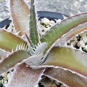 Qdyckiaのハイブリッドです。葉は緑色のままで、季節によって濃さが変わります。marnier-lapostollei的に太くカーブする美しいツヤ葉に、流れるような鋭い角度の付いた白い鋸歯が出ます。(撮影日:2025年07月29日)画像2、3は実際の親株で、販売株はこの親株から採れた子株になります。
