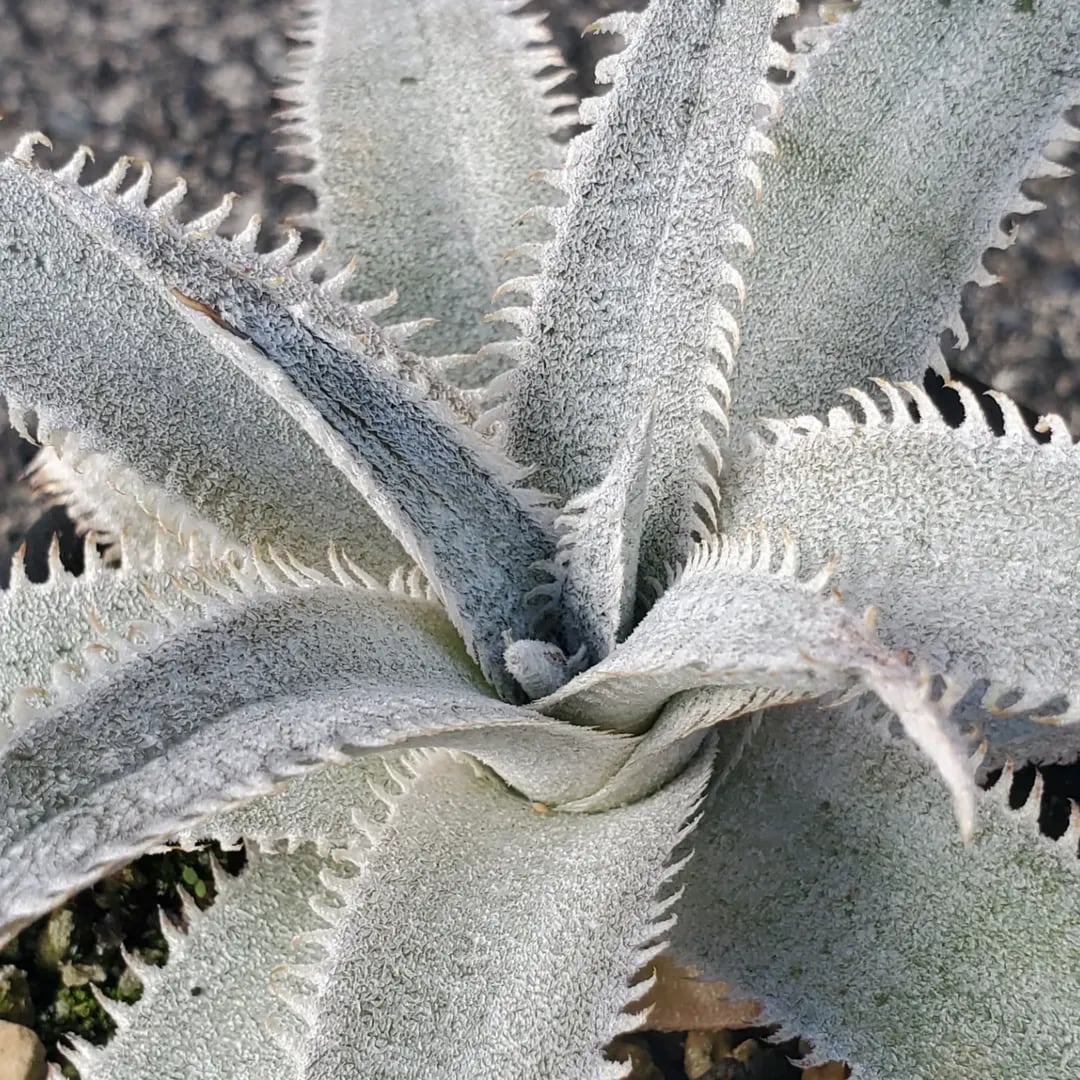BSI登録の、タイのParadon氏のハイブリッドです。MLをベースにしたカールする太葉にトリコームがのり、細かく刻むような小さな鋸歯が並びます。ディッキアの中では珍しい、淡い色合いの優しい雰囲気をした品種です。この品種のトリコームは、雨にも非常に強く、屋外で育てていてもなかなか薄くならず、美しさをキープしてくれます。(撮影日:2025年10月09日)画像2、3はNNNにある参考親株です。