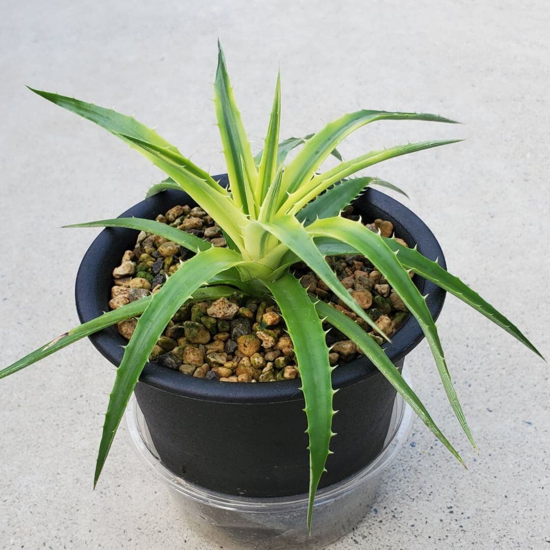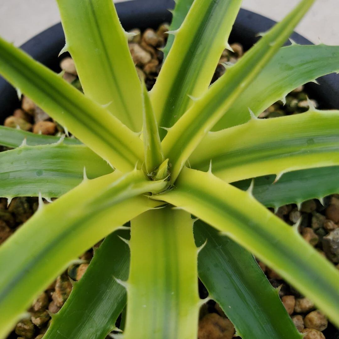 BSI登録の、タイのJob氏による原種encholirioidesからの選抜品種になります。ディッキアではあまり多くない斑入りの品種の一つです。しっかり太陽に当てて育てると、黄色~黄緑色の葉に、中央に緑のラインが入った、美しい姿になります。(撮影日:2024年10月6日)画像2、3は実際の親株で、販売株はこの親株から採れた子株になります。