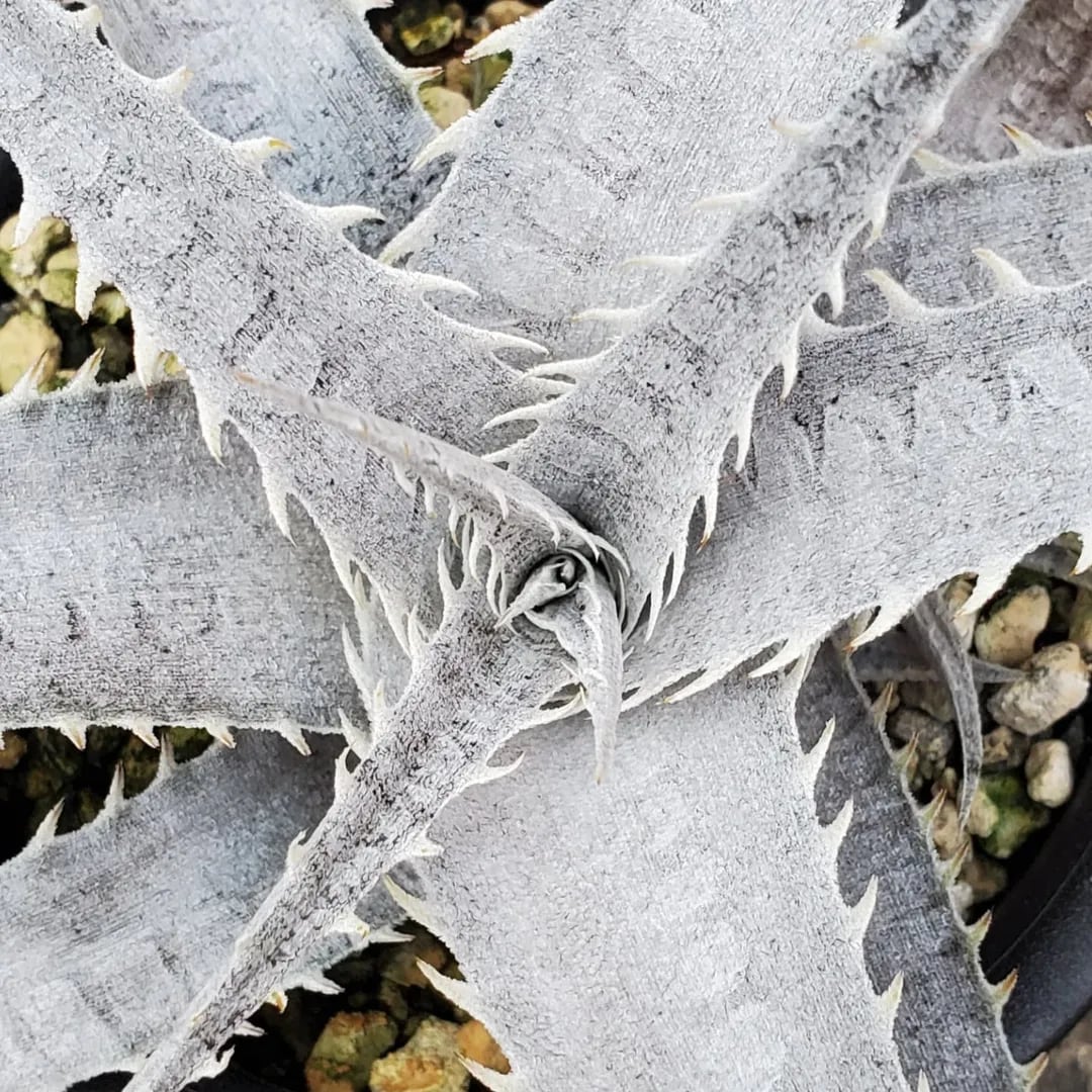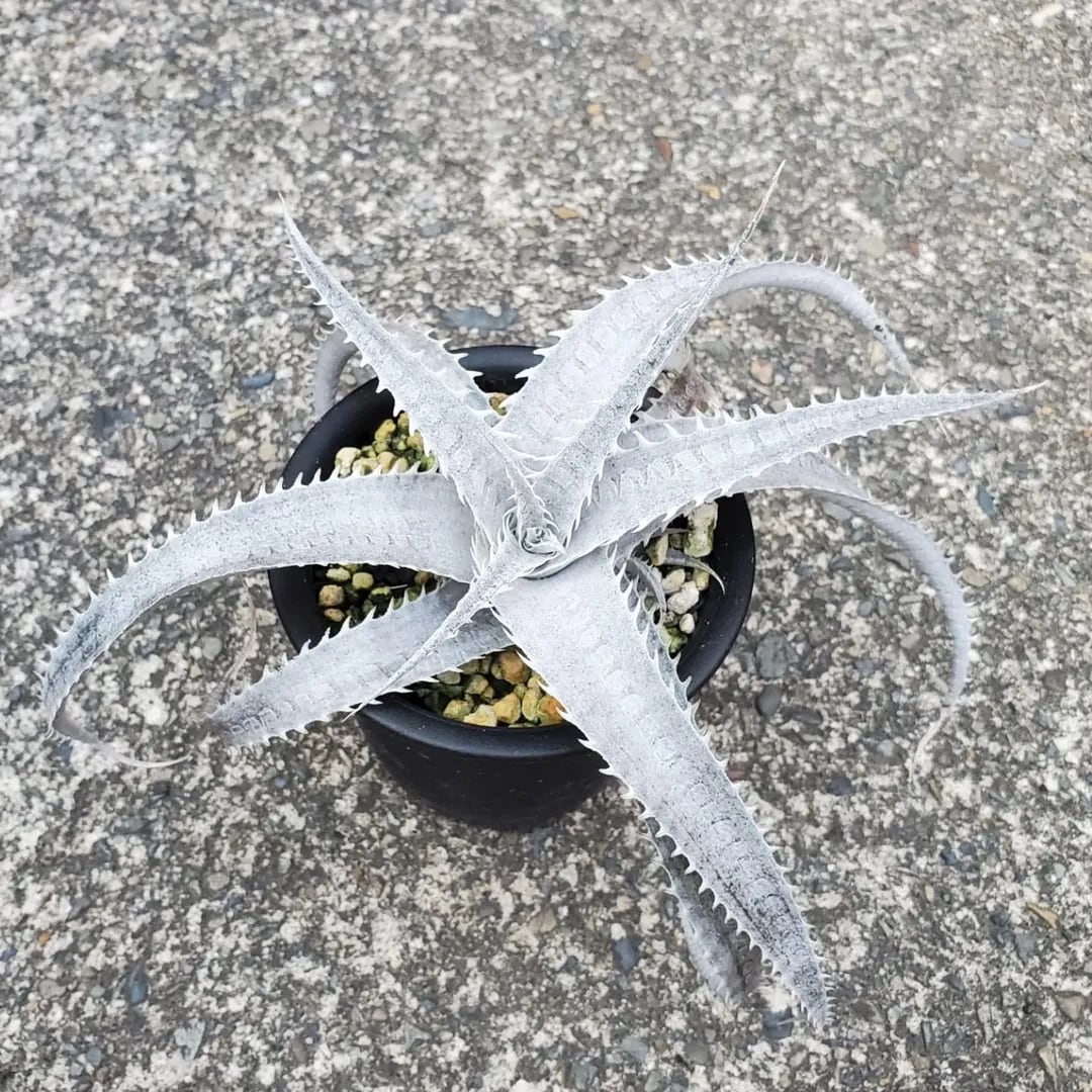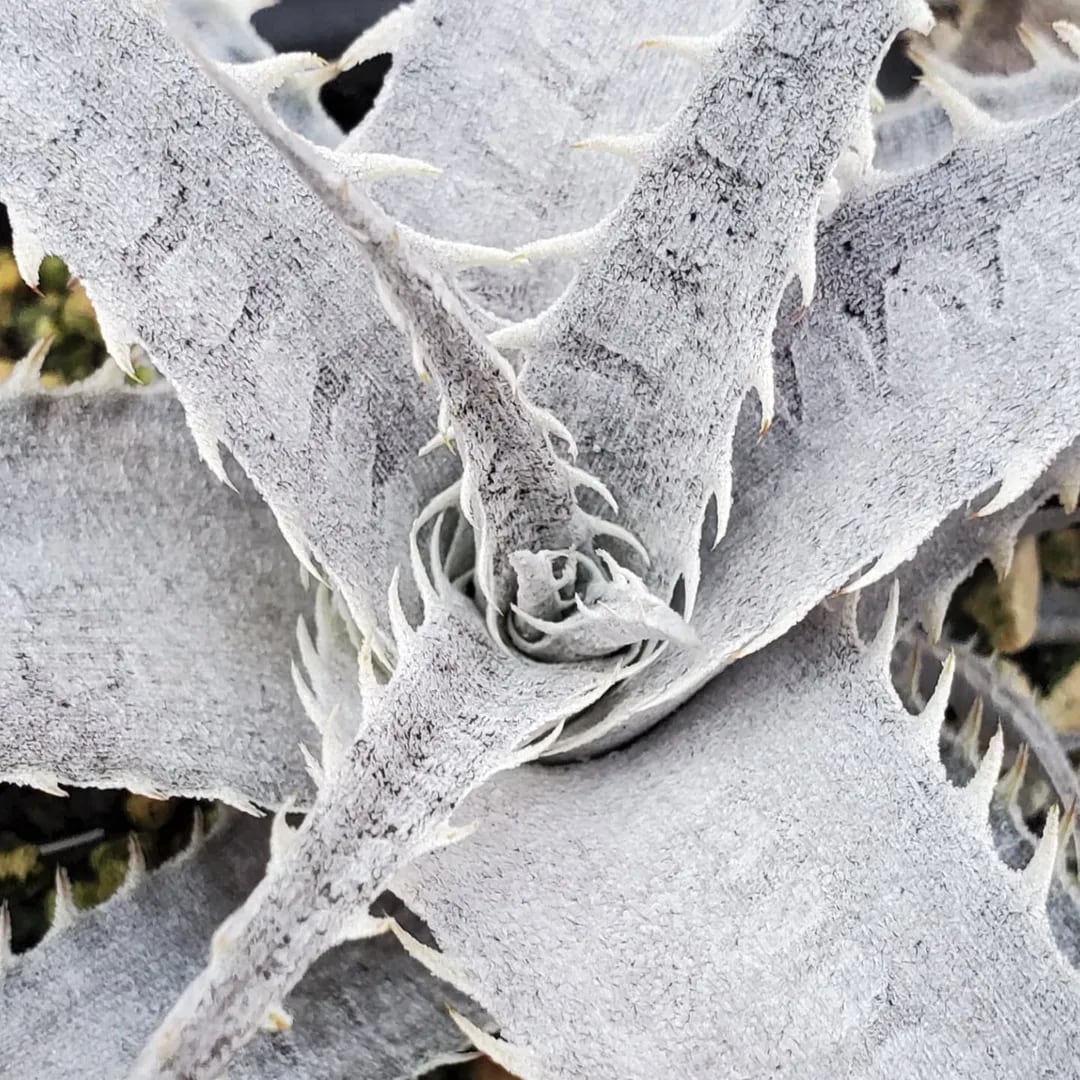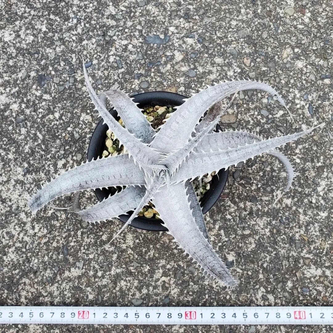 原種argenteaのF1株になります。トリコームで覆われた、真っ白で美しい姿になります。荒々しくうねりながら成長し、徐々に落ち着いたロゼット状になってきます。(撮影日:2025年07月29日)画像2、3は実際の親株で、販売株はこの親株から採れた子株になります。
