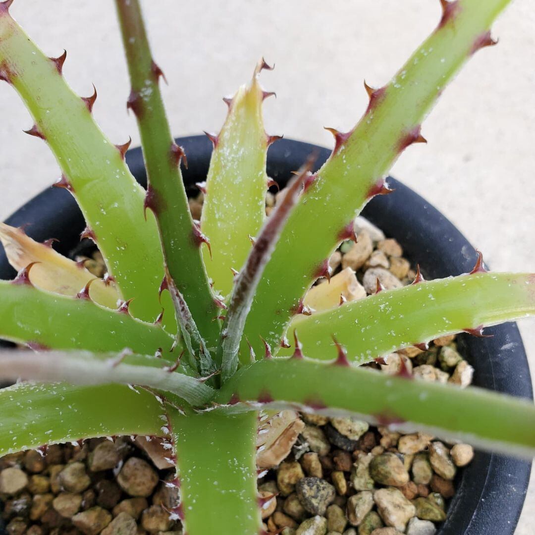 ディッキアと同じ科に属する、Hechtia(ヘクチア)の一種です。成長すると、放射状に葉を展開し、季節によっては中心が緑で、葉の縁から赤味が強く出てきます。(撮影日:2024年11月25日)画像2、3は実際の親株で、販売株はこの親株から採れた子株になります。