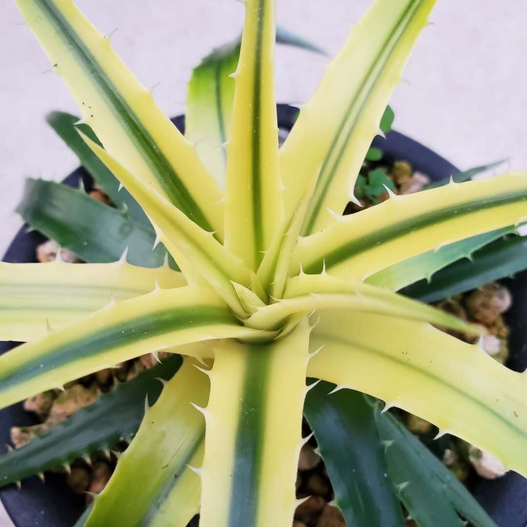 BSI登録の、タイのJob氏による原種encholirioidesからの選抜品種になります。ディッキアではあまり多くない斑入りの品種の一つです。しっかり太陽に当てて育てると、黄色~黄緑色の葉に、中央に緑のラインが入った、美しい姿になります。(撮影日:2024年12月8日)画像2、3は実際の親株で、販売株はこの親株から採れた子株になります。