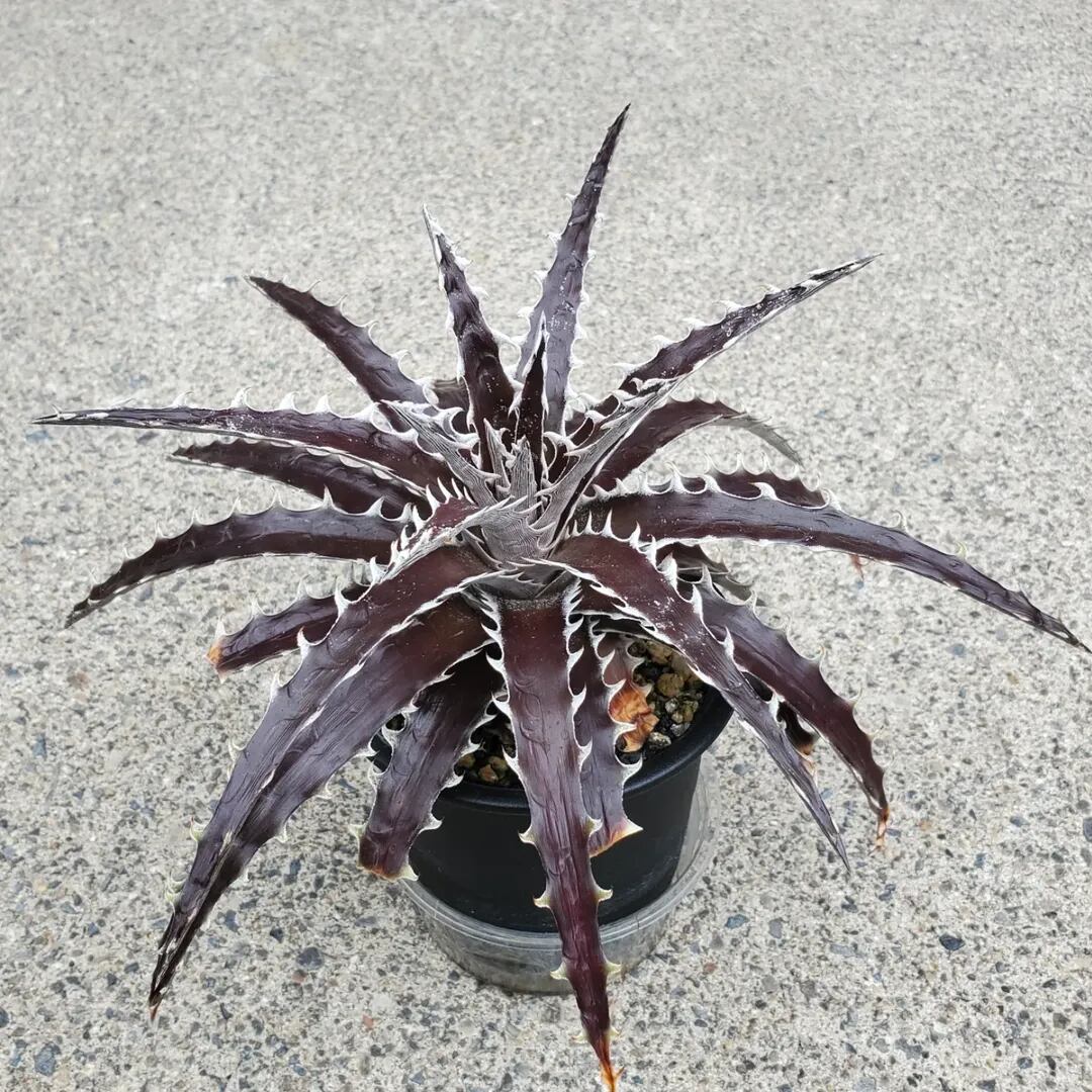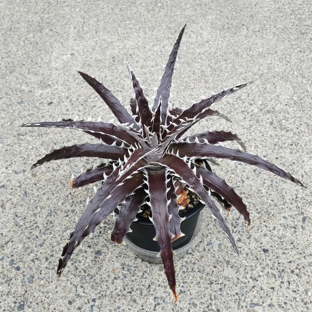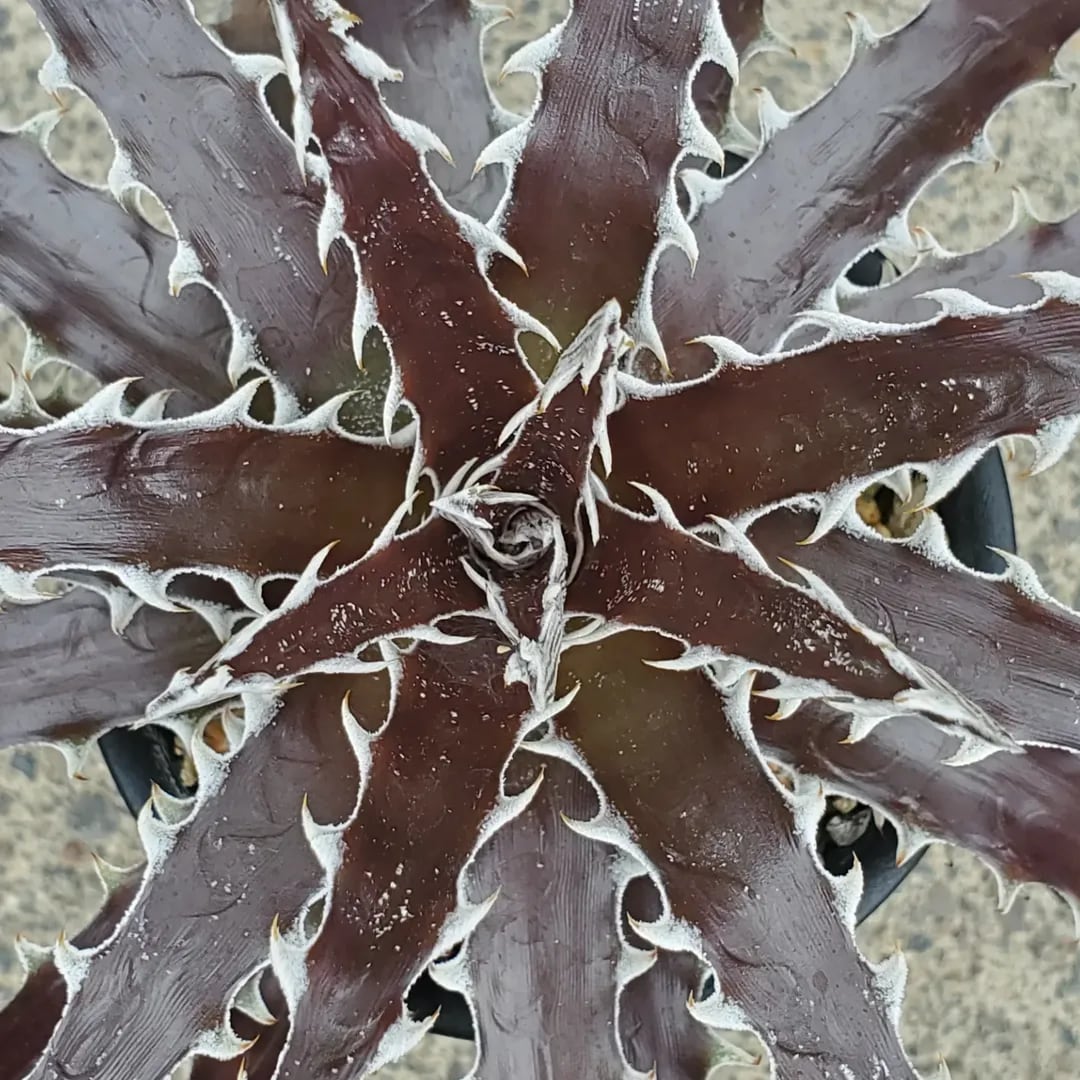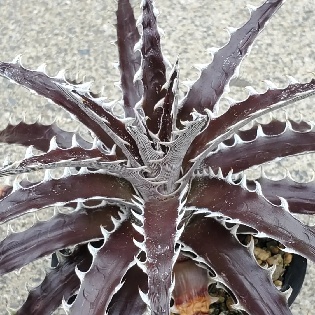 タイのOtto氏のハイブリッドです。赤紫色の葉に、大きく鋭く白い鋸歯が並び、かなり厳つい雰囲気になります。(撮影日:2025年10月20日)画像2、3は実際の親株で、販売株はこの親株から採れた子株になります。