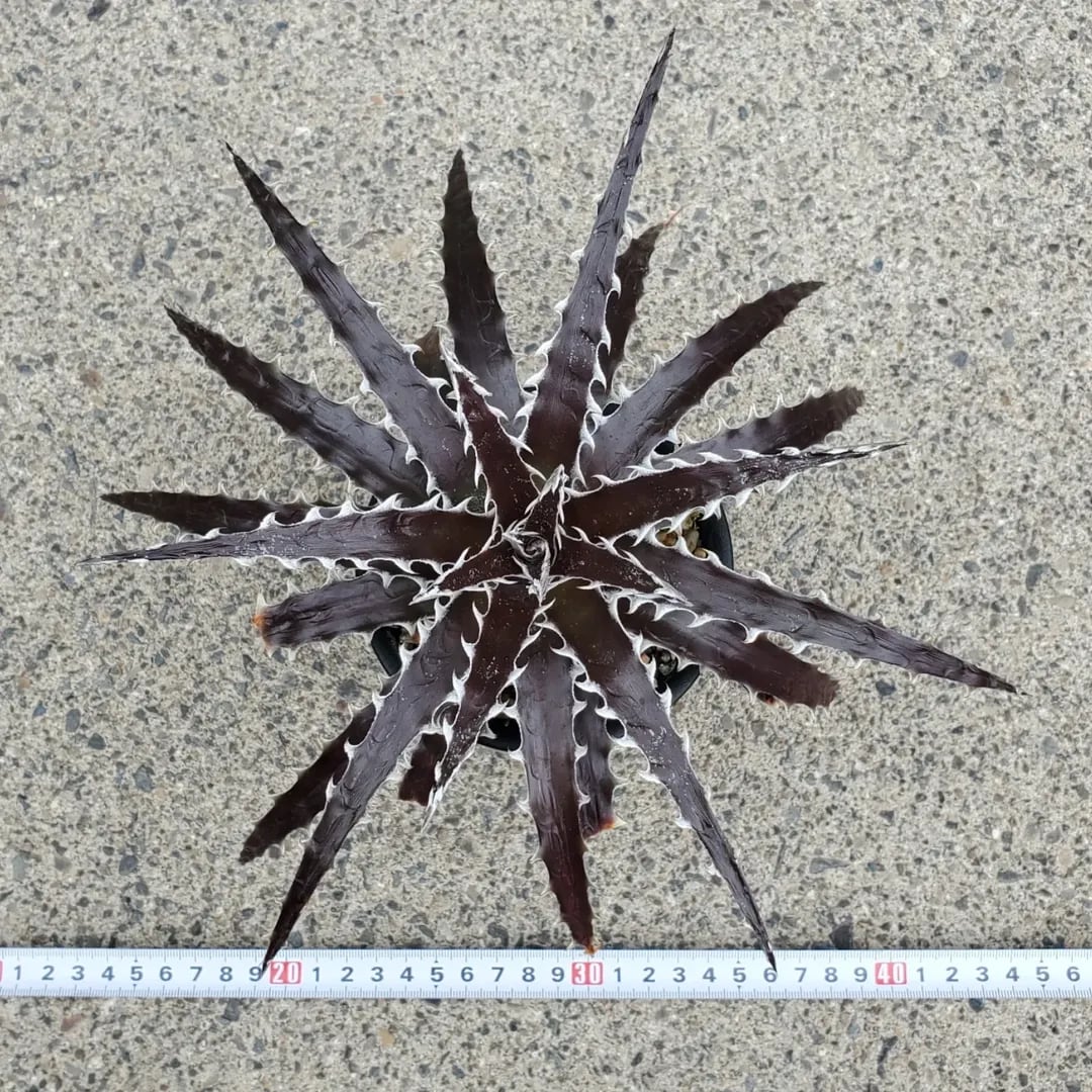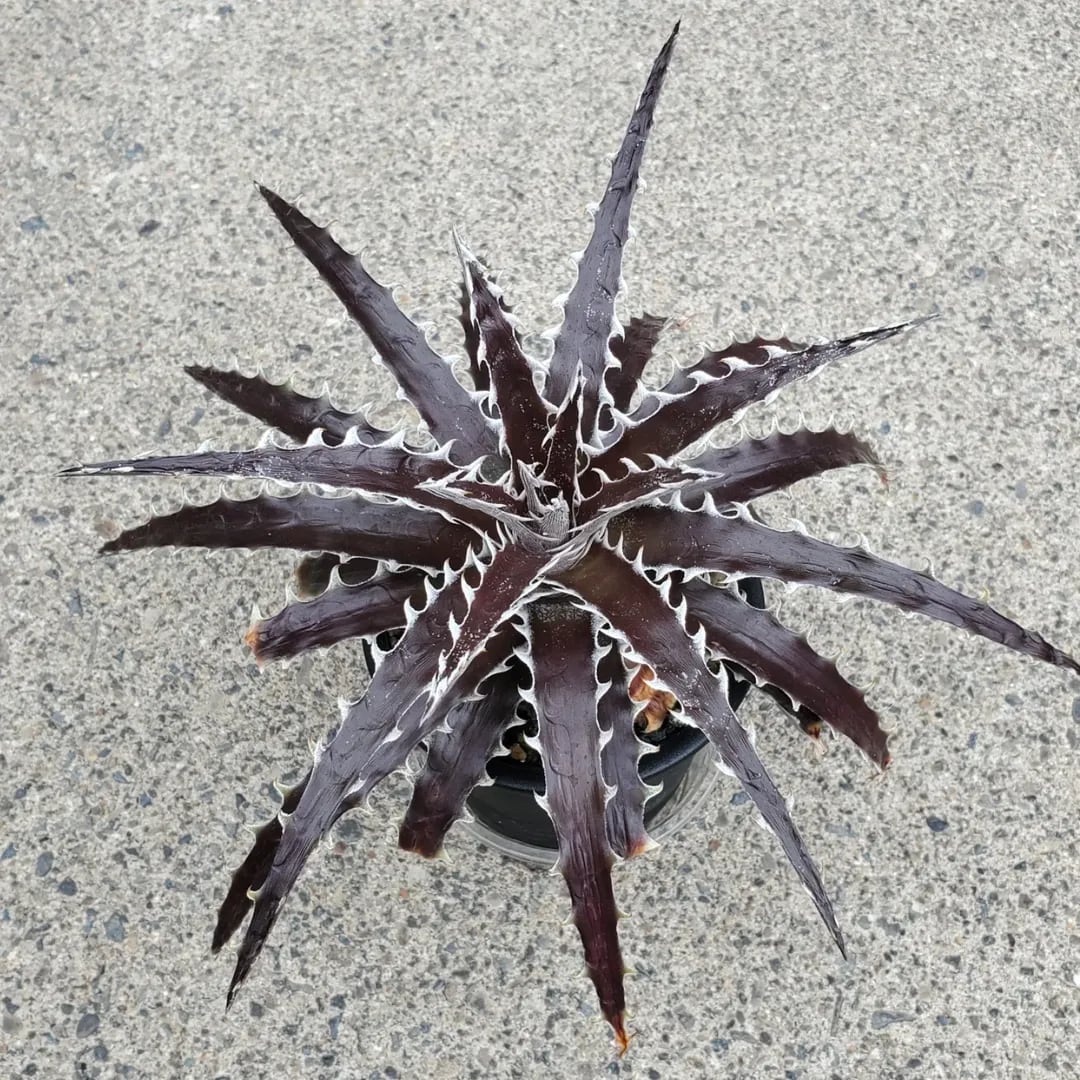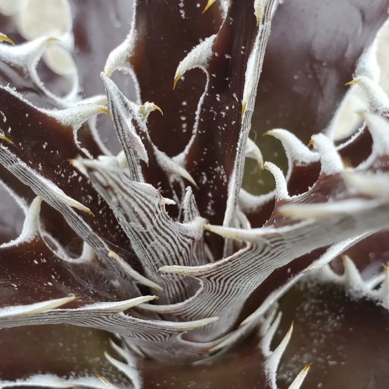 タイのOtto氏のハイブリッドです。赤紫色の葉に、大きく鋭く白い鋸歯が並び、かなり厳つい雰囲気になります。(撮影日:2025年10月20日)画像2、3は実際の親株で、販売株はこの親株から採れた子株になります。