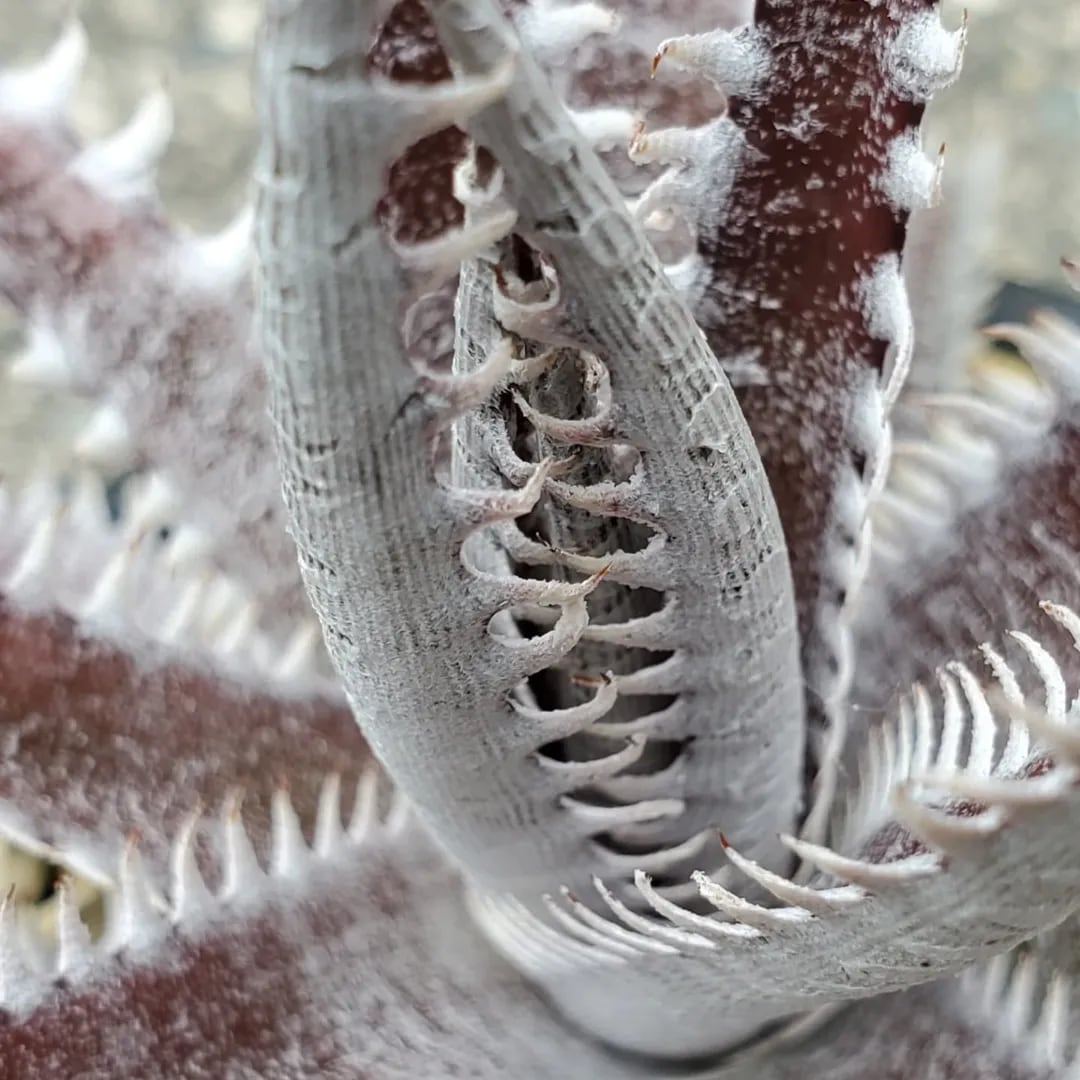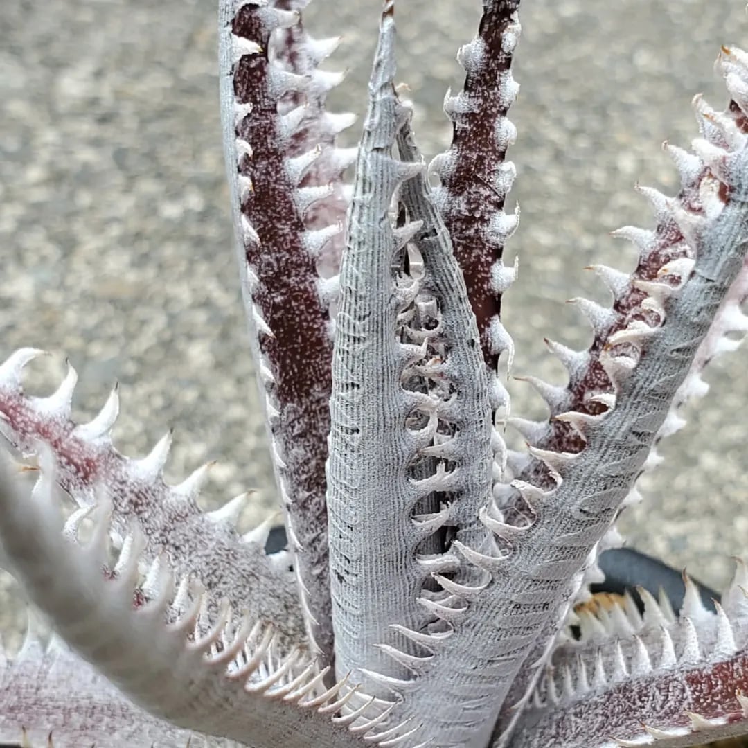 赤地の肌に白い鋸歯が密に並び、ドリル上に展開するAmazonico産のレアなハイブリッドです。(撮影日:2025年08月13日)